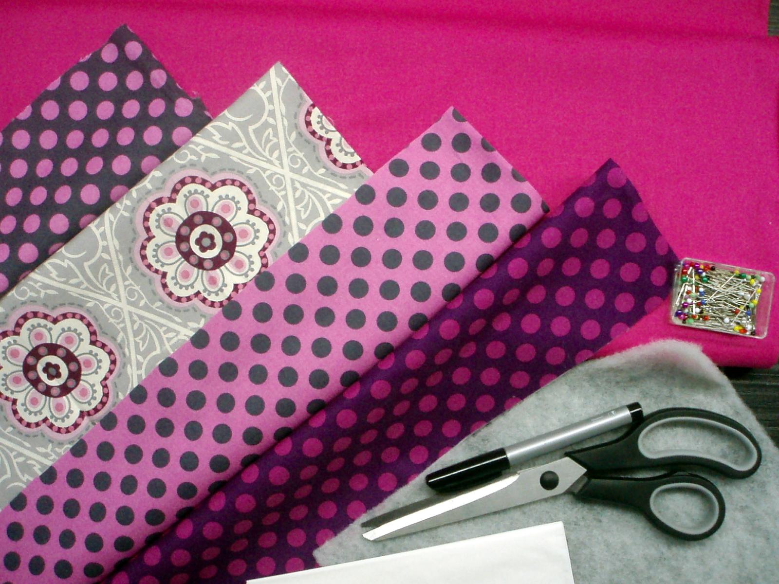 Budeme potrebovať: hlavnú látku 40cm (šírka 110cm), zvyšky látok farebne ladiacich, tenký vatelín 30cm x 30cm, papier, nožnice a ďalšie šijacie potreby