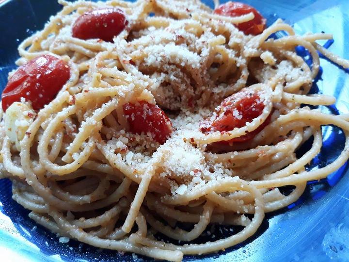 Dneska obedik. Celozrnne spagety s rozmixovanou cuketou.