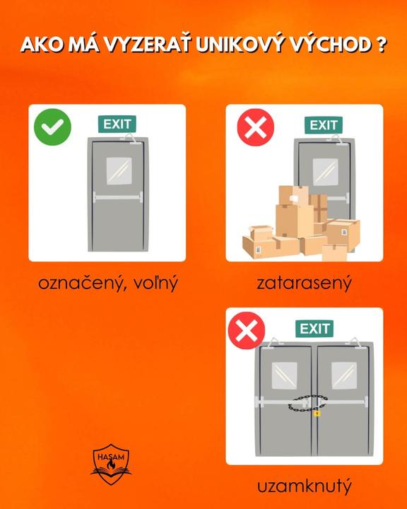 ✅ Unikový východ musí byť viditeľný, označený a voľný na prechod.