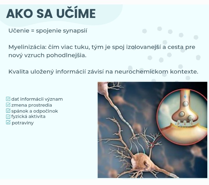♀️ Pohyb stimuluje tvorbu látok podporujúcich tvorbu myelínu – skúste krátku prechádzku pred učením.