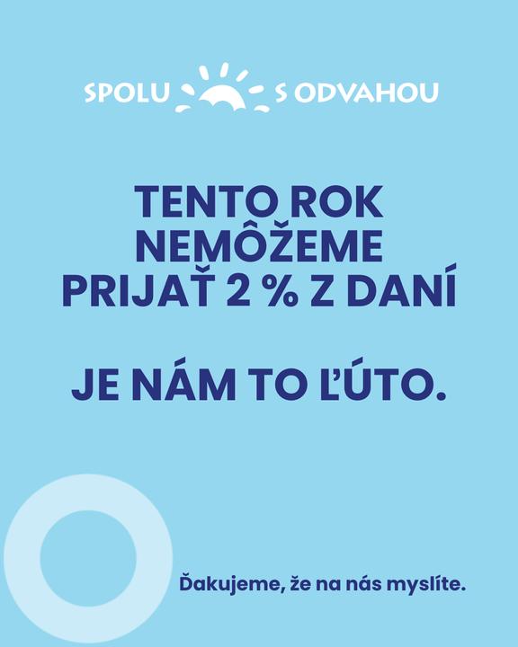 O to viac nás mrzí, že v tomto roku 2 % prijímať nemôžeme. Pre administratívnu chybu sme nesplnili jednu z formálnych podmienok potrebných na registráciu medzi prijímateľov. Je to naša zodpovednosť a úprimne nás mrzí, že vám tento rok nemôžeme dať možnosť podporiť nás práve touto formou.