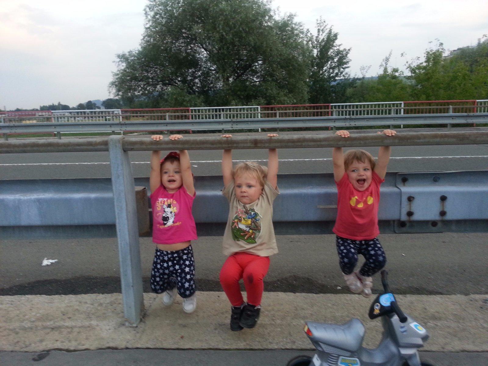 Moje trojicky miluju pohyb a sport. Preliezky si vdaka ich uzasnej fantazii dokazu vymysliet aj na moste pri ceste (na foto). Miluju aj skakanie na trampoline - zatial vyuzivame trampolinu u nasich susedov, no ta ma najlepsie roky uz davno za sebou, tak v pripade vyhry by sa to otocilo a chodili by oni ku nam 😁
