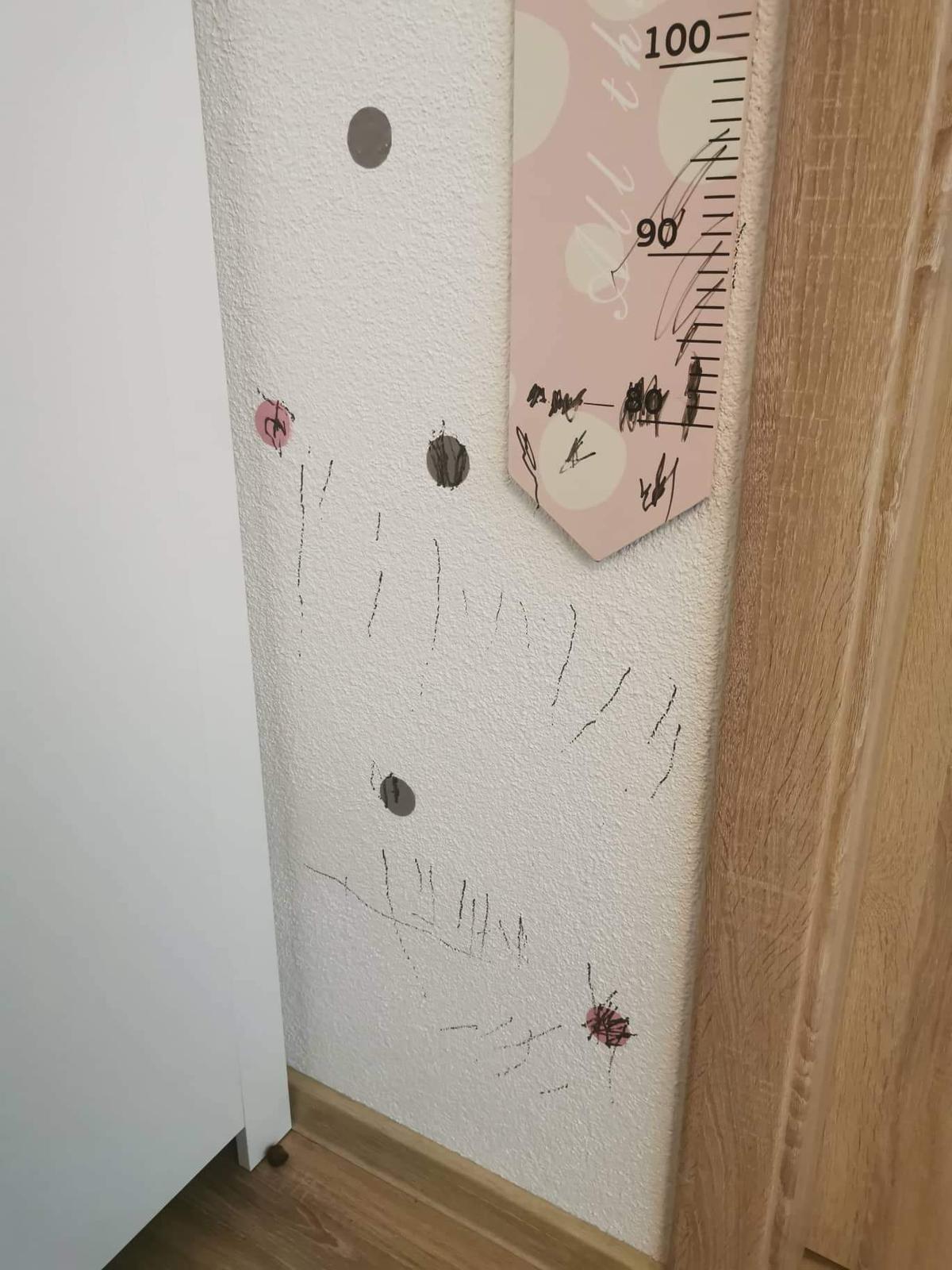 Počas karantény sme ju ako obvykle išli zmerať na nastennom metre. Meter začína od 80cm. Konečne dosiahla 81cm a my s mužom nadšení, zobrali sme fixku, zaznacili presnú čiarku a pripísali dátum. Samozrejme deti sú špongie. Sledujú, nasávajú informácie a potom konajú tak, ako vidia. Fixka patrila našej Lei k magnetickej tabuli na písanie. Tam sme ju odložili a išli z izby preč. Naša dcéra sa tam ostala hrať. Keď bolo dlhšie ticho, áno to podozrivé pár minútové ticho, išla som sa pozrieť čo robí. Stala pri metri, s fixkou v ruke. Zacmarany dátum, pár umeleckých diel na stene vedľa. Pomoc, izbu sme prerabali pár mesiacov dozadu. Ale iba som sa nadýchla vydýchla a s kľudom Angličana som jej povedala ze kreslí sa iba na tabuľu. Predsa nerobila nič zlé. Robila iba to, čo pred chvíľkou videla robiť nás🙈😅😂.