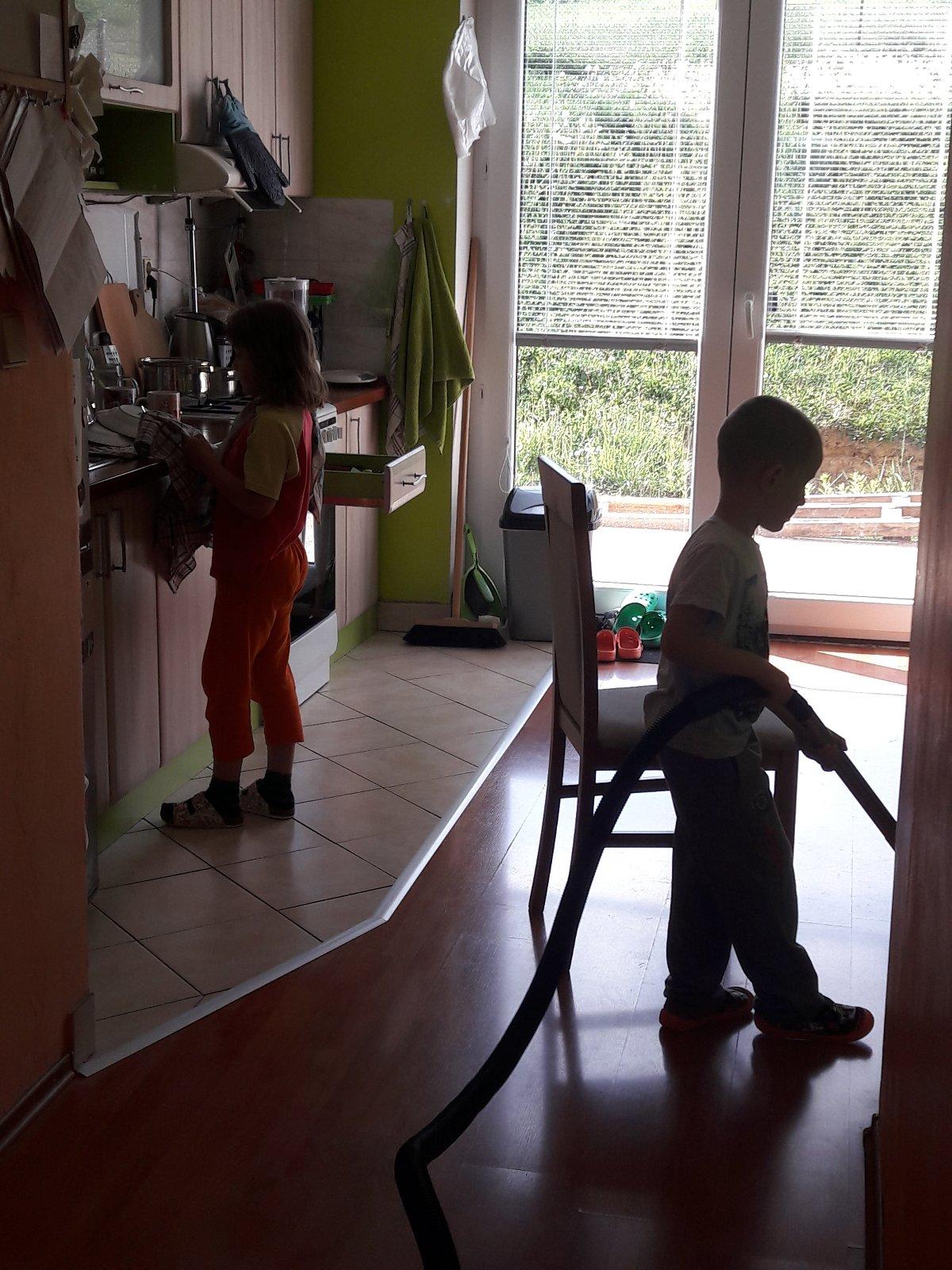 Dobrovolnu pomoc mojich 2 deticiek (6 a 5 rocne) , pri upratovani domacnosti.Kazda matka si tuzi aspon na chvilku oddychnut od kazdodennych povinnosti a za mnou prisli moje deti ze mi chcu pomoct a nech si ja chvilku oddychnem.