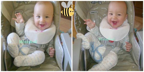 Alexej je dojcene dietatko, cize 1x okusil prikrm az v pol roku. Bol to zemiak a teda chutil mu velmi, no bala som sa, ze ho bude boliet brusko tak som zacinala len po troske a on sa velmi zlostil, ze preco este nedostane🙂 Asi po tyzdni prikrmovania dokazal zosrotoval 250ml prikmu :D Je to papkac a velky loptos, v jedalenskej stolicke skusa rozne gymnasticke kreacie🙂