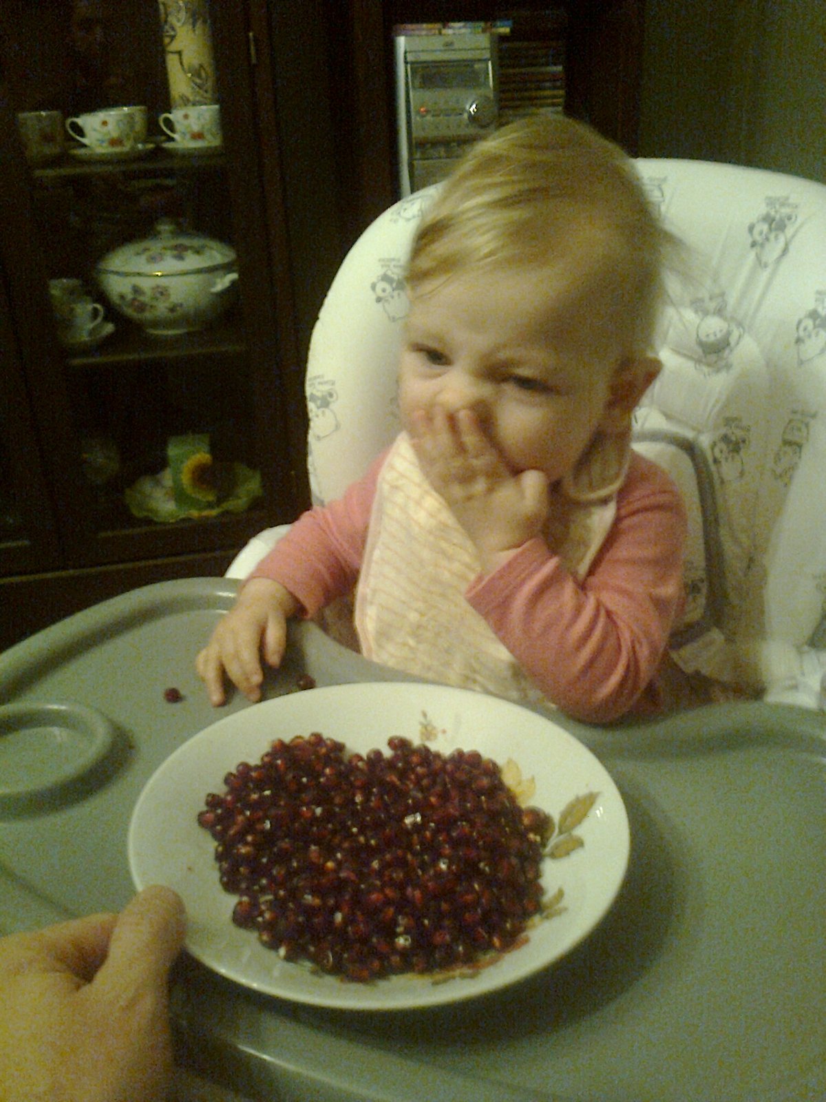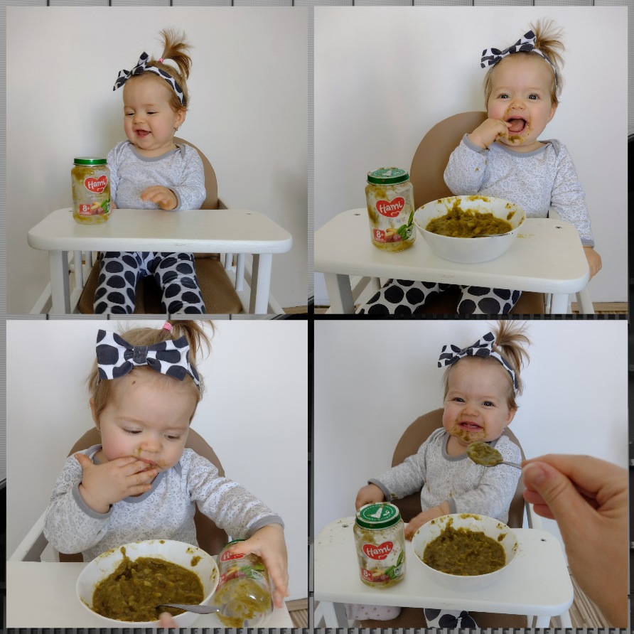 Naša Veronika uz ochutnala mrkvu, zemiak, tekvicu, cuketu, ale asi najviac jej chutil banan. Bude na sladke 😉😘😉 Vyhre by sme sa potesili.