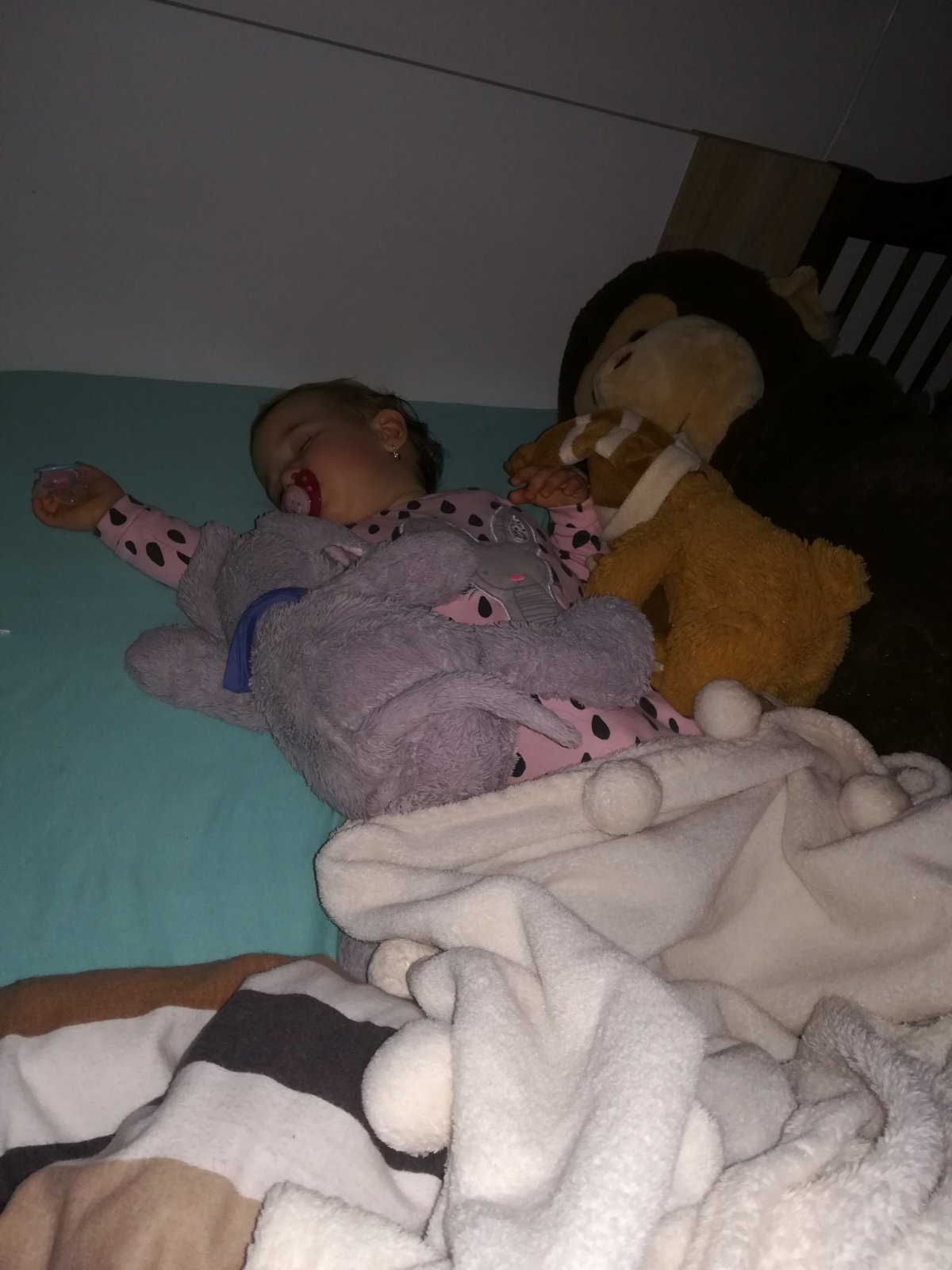 Dcérka má 15mesiaciv a od narodenia ju trápi veľmi suchá pokožka a posledne mesiace aj nepekny ekzém na rucickach. Častá sa kvôli svrbí ej pokožke v noci budieva, takže po každom kúpeli sa kremikujeme, teda snažíme sa, keďže to našej bojovníčke občas nie je príjemné. Preto po novom, natieram ja ju, ona svoju babiku alebo mne tvár 🙂. Ked uz sme pripravené na spánok uložíme spinkať plysaky a nakoniec sa k nim uloží aj naša opička 🙂