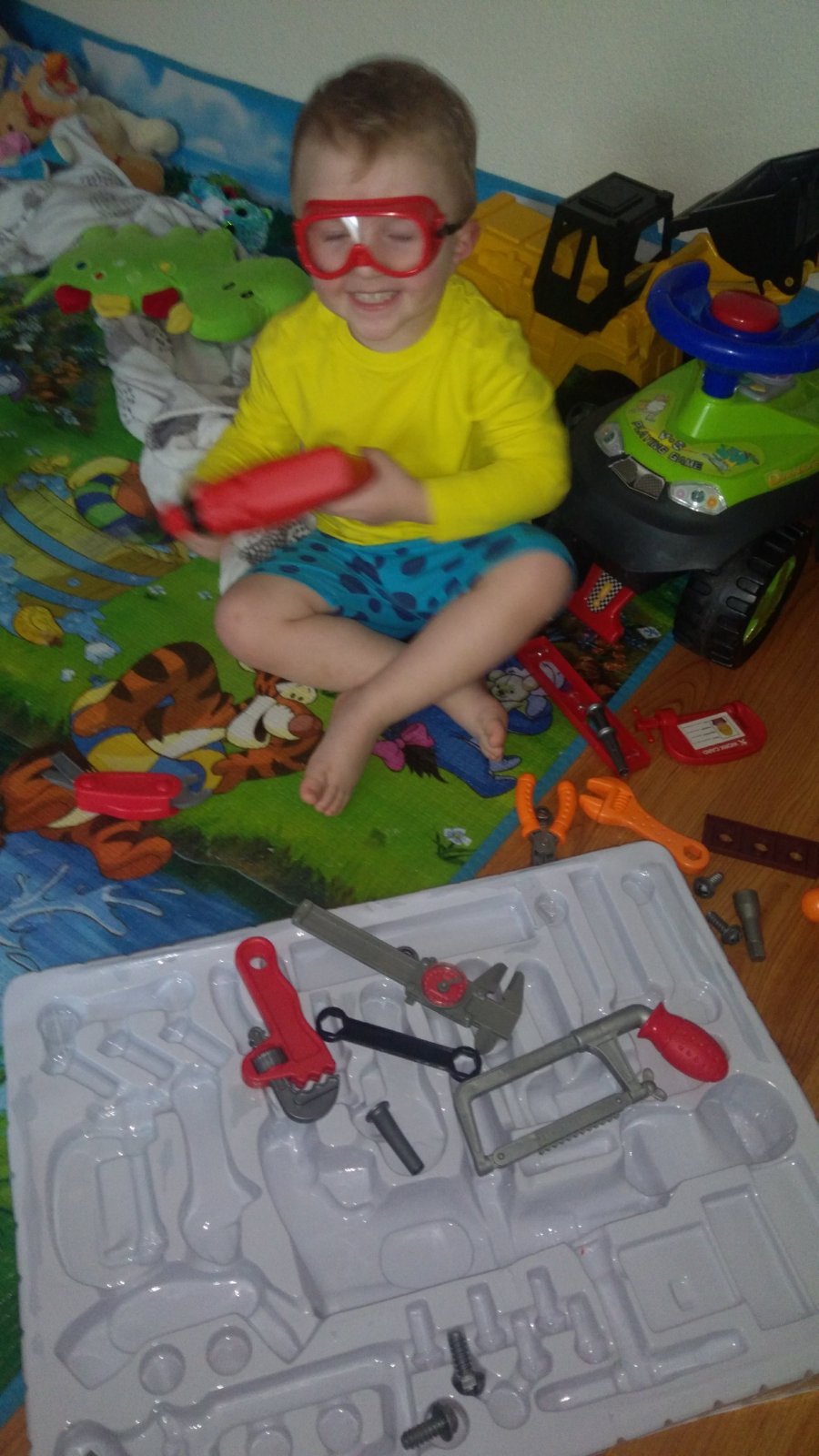 Radosť z náradia bola obrovská lebo mohol opravovať ako tato, ale len do momentu kým neprišla mladšia bojovníčka a nezačala mu brať všetko ;D