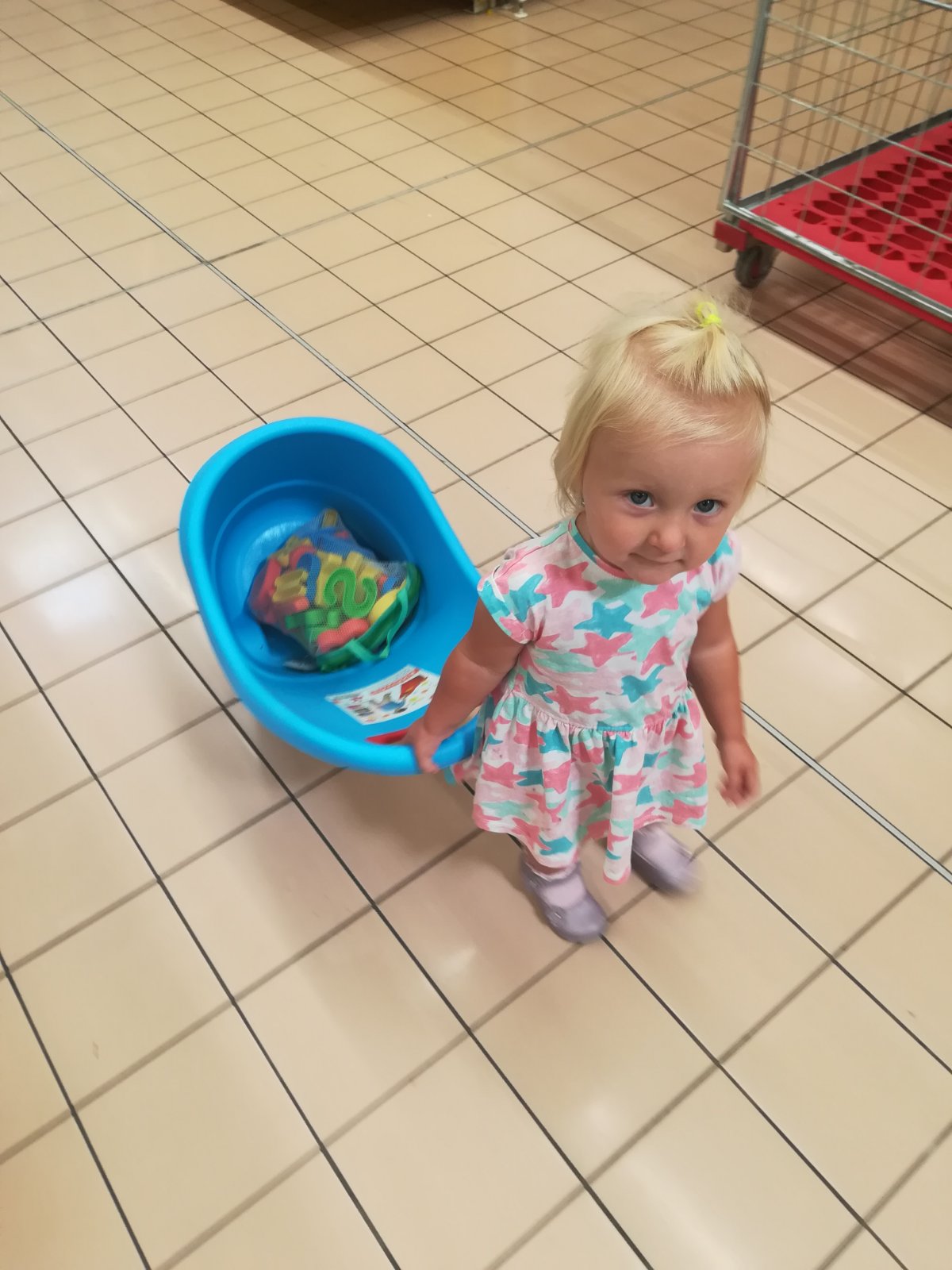 Sama si vybrala v obchode darček písmenkove formičky a sama si ho aj odviezla do auta... Aby to mala jednoduchšie, tak si písmenkove formičky vložila do furika, čo nasla v regali... No nemohla som z nej... Ta hrdosť, keď si to sama viezla😂