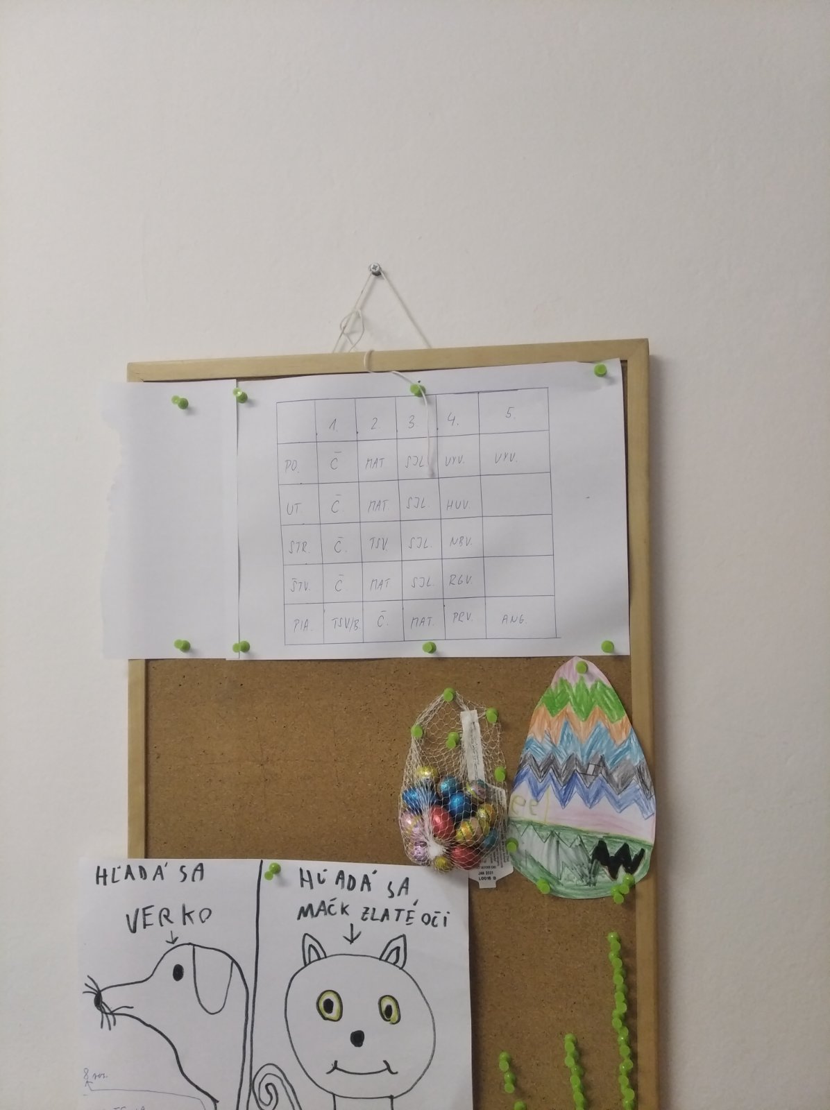 Zadovážili sme si nástenku. Keď sa bol v zime mladší syn bobovať, bral si vždy so sebou svoju plyšovú mačku a psíka. Raz ich zabudol na zástavke. Starší syn mu vyrobil inzerát, že sa hľadajú jeho plyšové zvieratká. Všetko nakoniec dobre dopadlo. Zvieratká sa našli. Potom mladší syn vyrobil kraslicu z papiera na Veľkú noc.