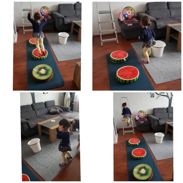 Ked sme nemohli chodit na ihrisko, vymysleli sme si zabavu doma. Domacu telocvicnu 😁 skakanie po vankusoch, preliezanie popod stolicku, preliezt cez taburetku, hodit gulicky na terc, loptu do vedra, vyliezt na rebrik 😁