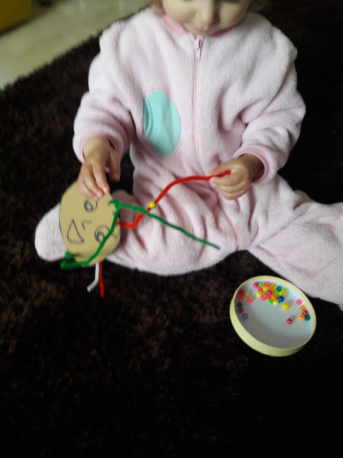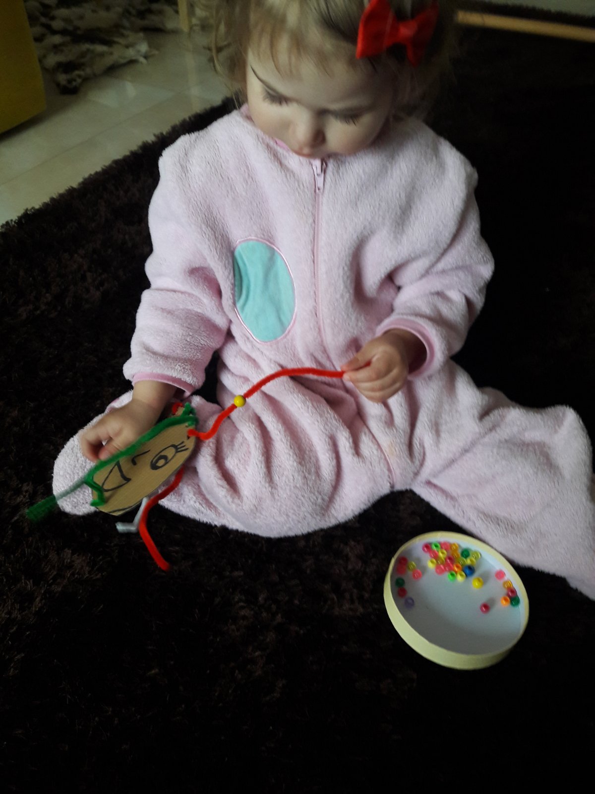 @sutaz vyrobili sme si takuto navliekacku, zo stareho kartona, plstenych drotikov a koralkov. Hrali sme sa, ze ozdobujeme dievcatku vlasky.