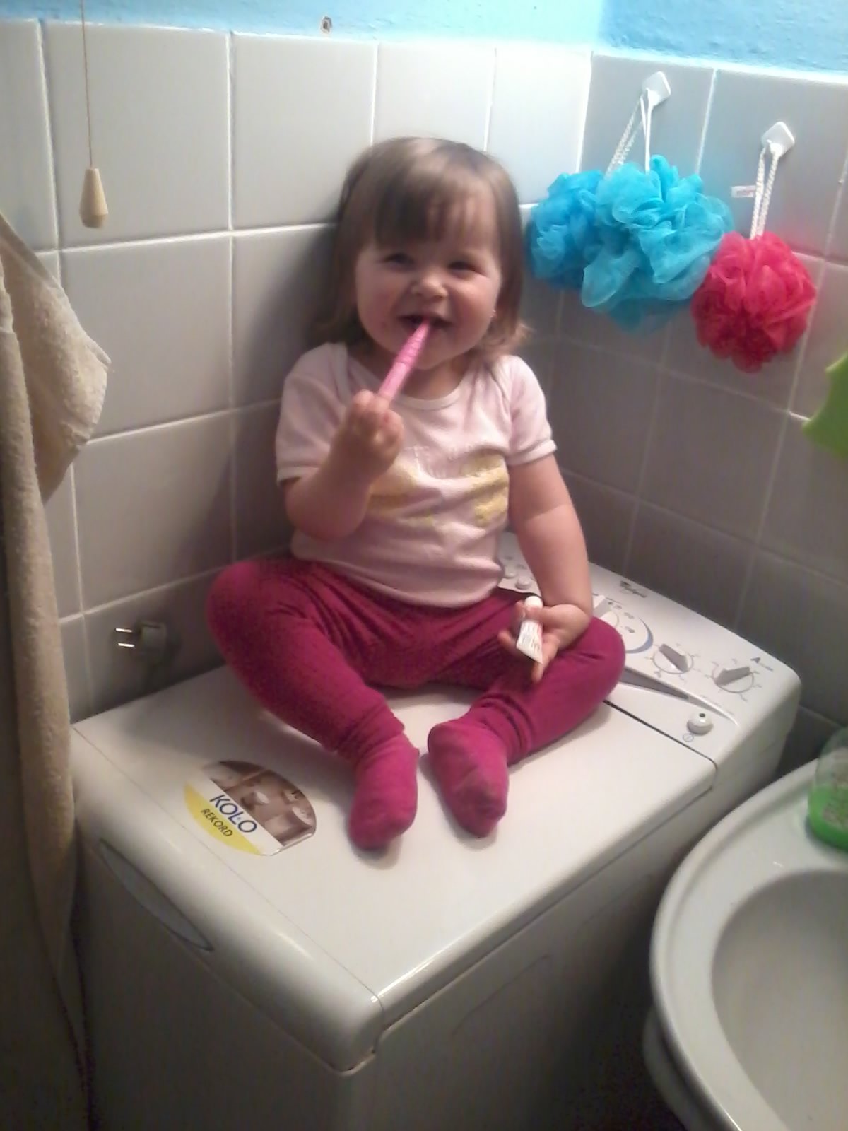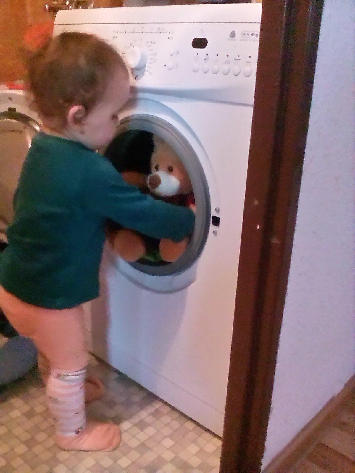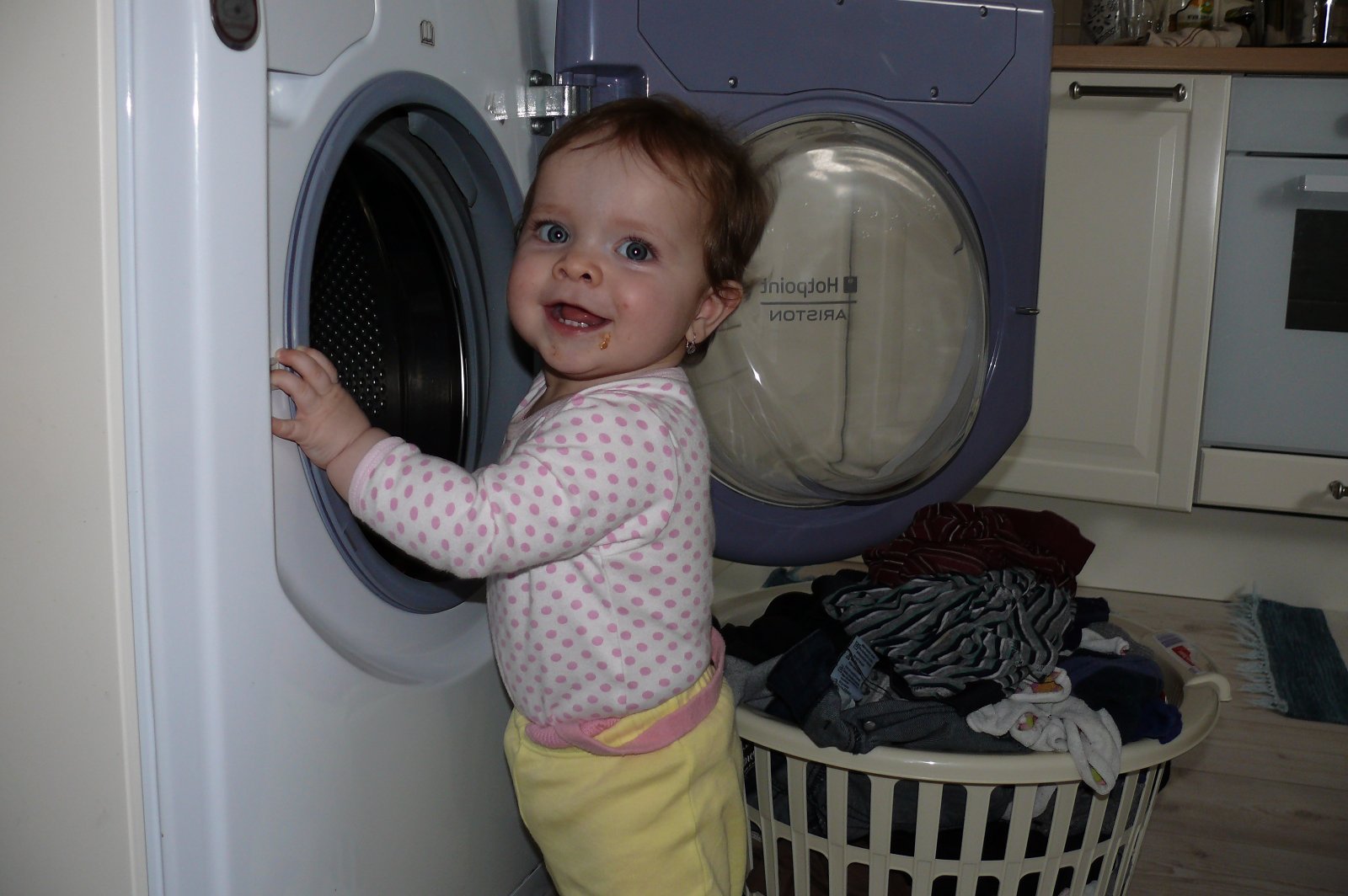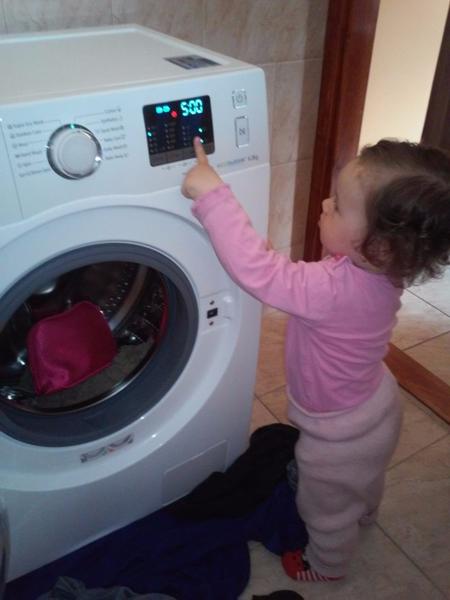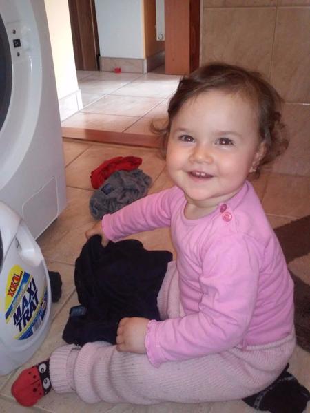 A takto mi moja dcerka Laurinka pomaha pri prani a vytahovani bielizne z pracky. Vzdy ked vidi, ze sa chystam prat uz mi uteka asistovat. Podava mi z kosa spinave pradlo, ja ho nachadzem do pracky a ona caka. Ked je doprane uz ma vola aby som pradlo povytahovala a ona mi ho nosi k susiaku.