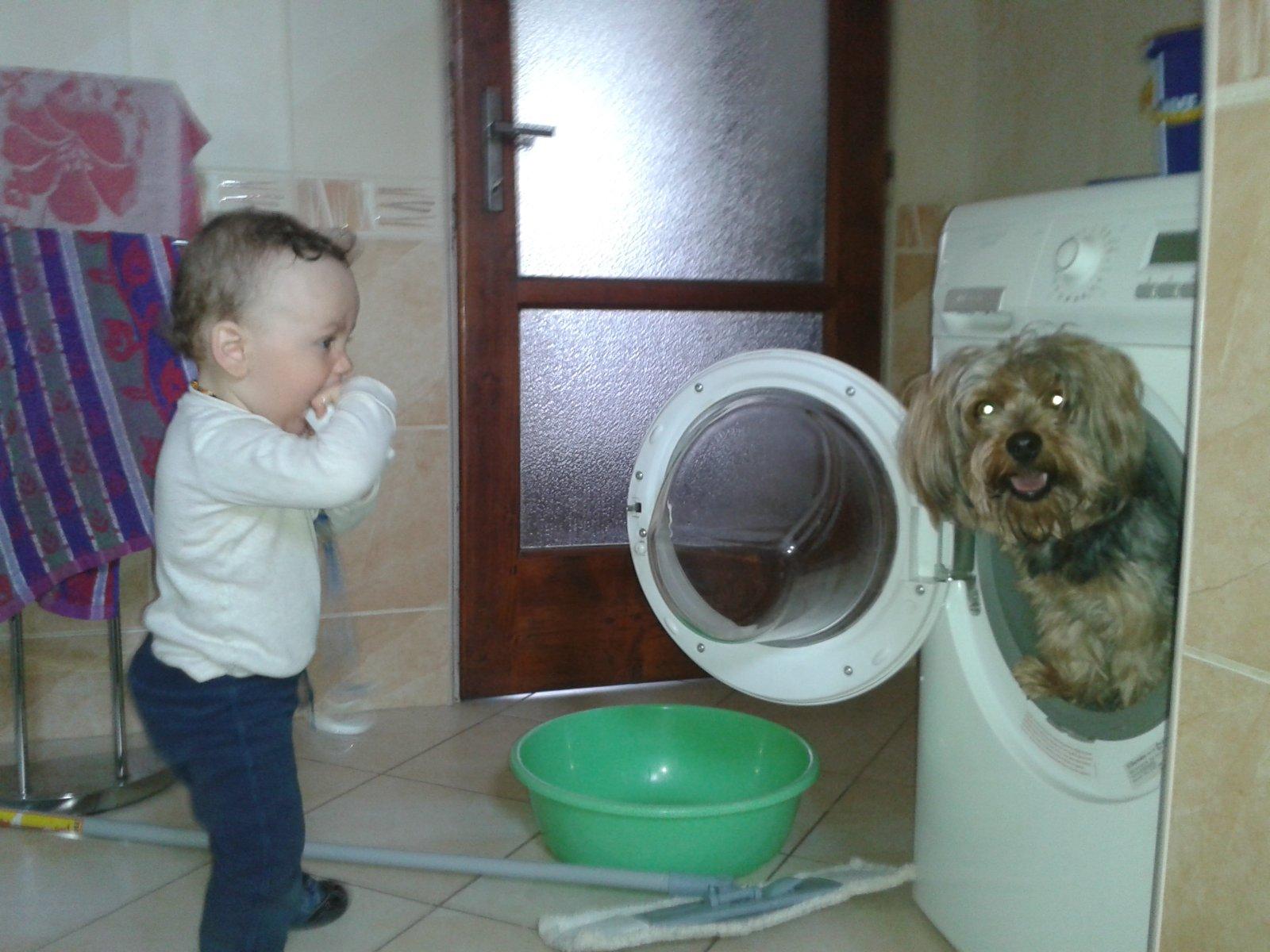 Priznám sa, že práčka na fotke nie je naša. Z tej fotky je to len moje dieťa. Bývame totiž u mojich rodičov a čoskoro sa budeme sťahovať. Práčku ešte kúpenú ani nemáme a preto ma táto súťaže veľmi potešila. Keď sa presťahujeme, tak skôr musíme kúpiť chladničku a kým sa našetrí na práčku, budeme prádlo nosiť k rodičom. No ale k veci. To je mamkin pes Elvis a náš Matúš prichytený pri "hre". Na spodnej fotke vidieť moju mamku za dverami. To len začal cirkus 🙂 Neviem, aký je obľúbený psíkov program, no a najradšej periem na 30 minút (teda pokiaľ si prádlo nevyžaduje lepšie vyprať).