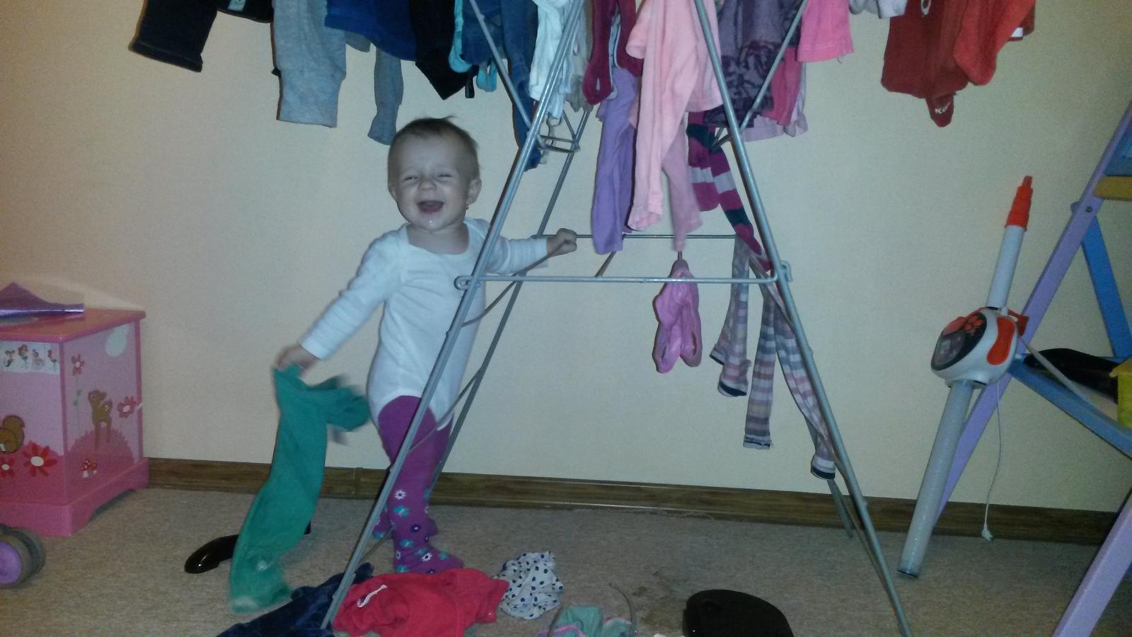 Nemame vtipnu fotku, lebo dcerka sa pracky boji ako certa. Ani sa jej necudujem, kedze huci, vrci a ani na pohlad nie je vabna 😖 uplne sa nam rozpadava, tak vyberame novu. Ale rada pomaha pri vesani - ja zavesim, ona stiahne 🙂 takto nachadzam mokre pradlo po celom byte.