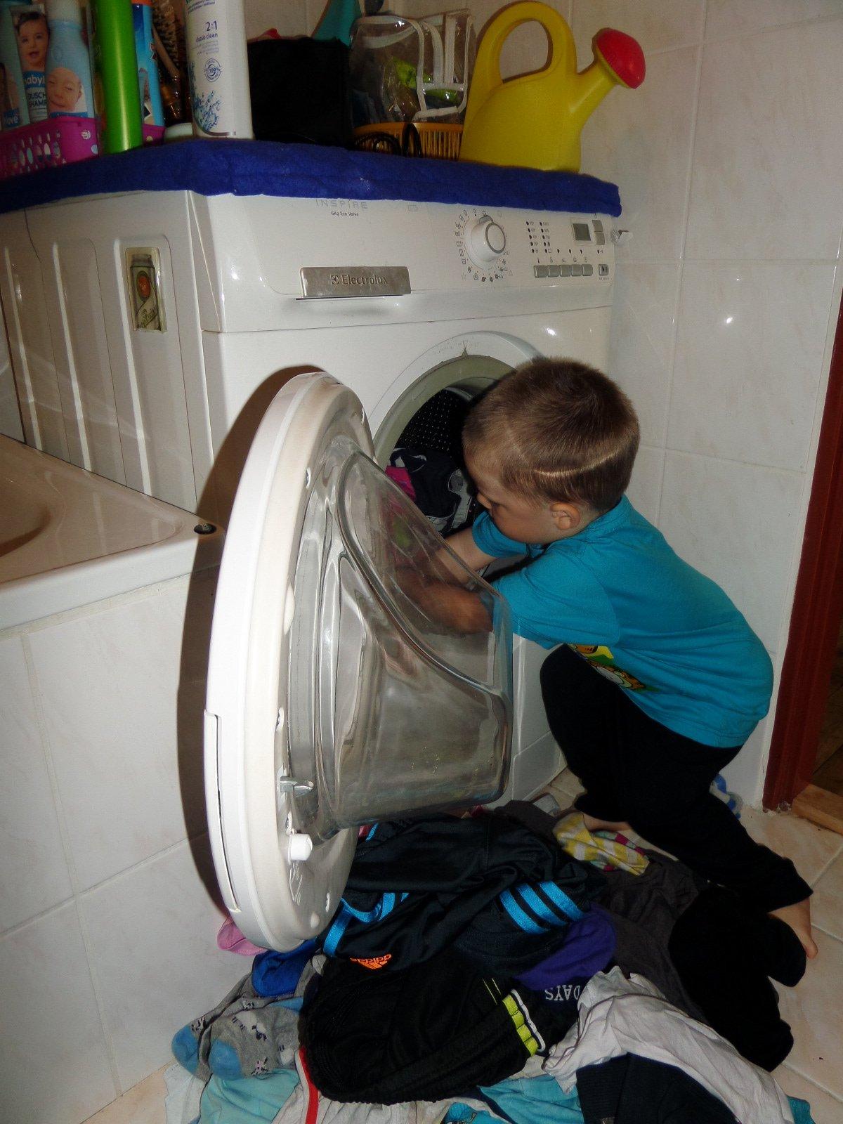 Tak ja síce vtipnú foto nemám, ale u nás každé pranie prebieha štýlom, že ja som len dozor. Menší naloží, nasype prášok (ja potajomky navolím program) a práčku spustí 😀 A potom pozoruje 🙂