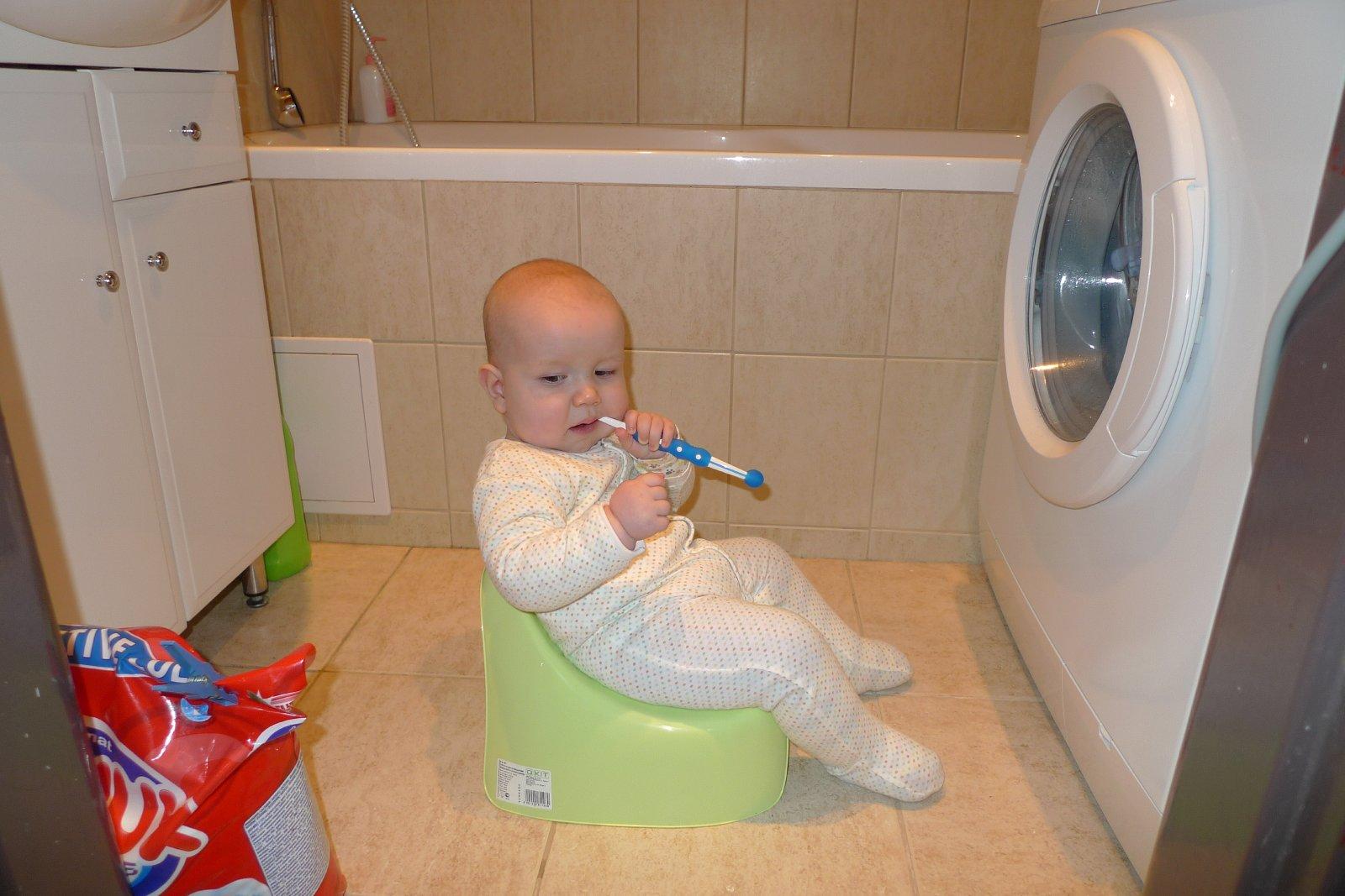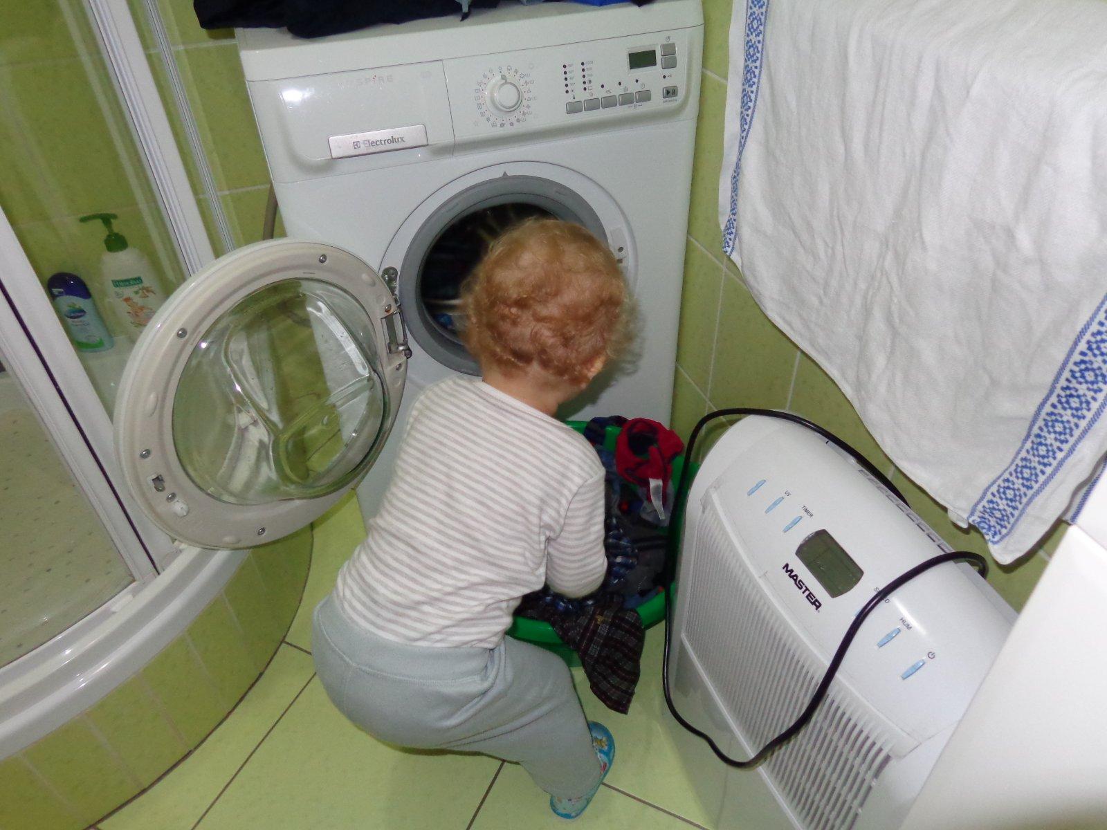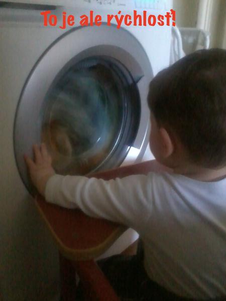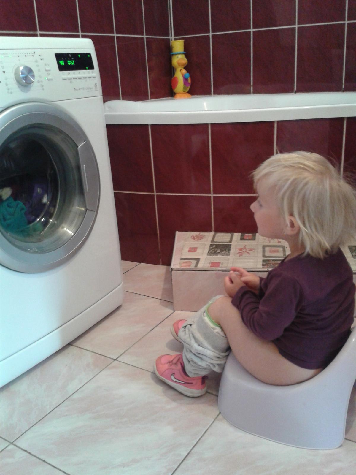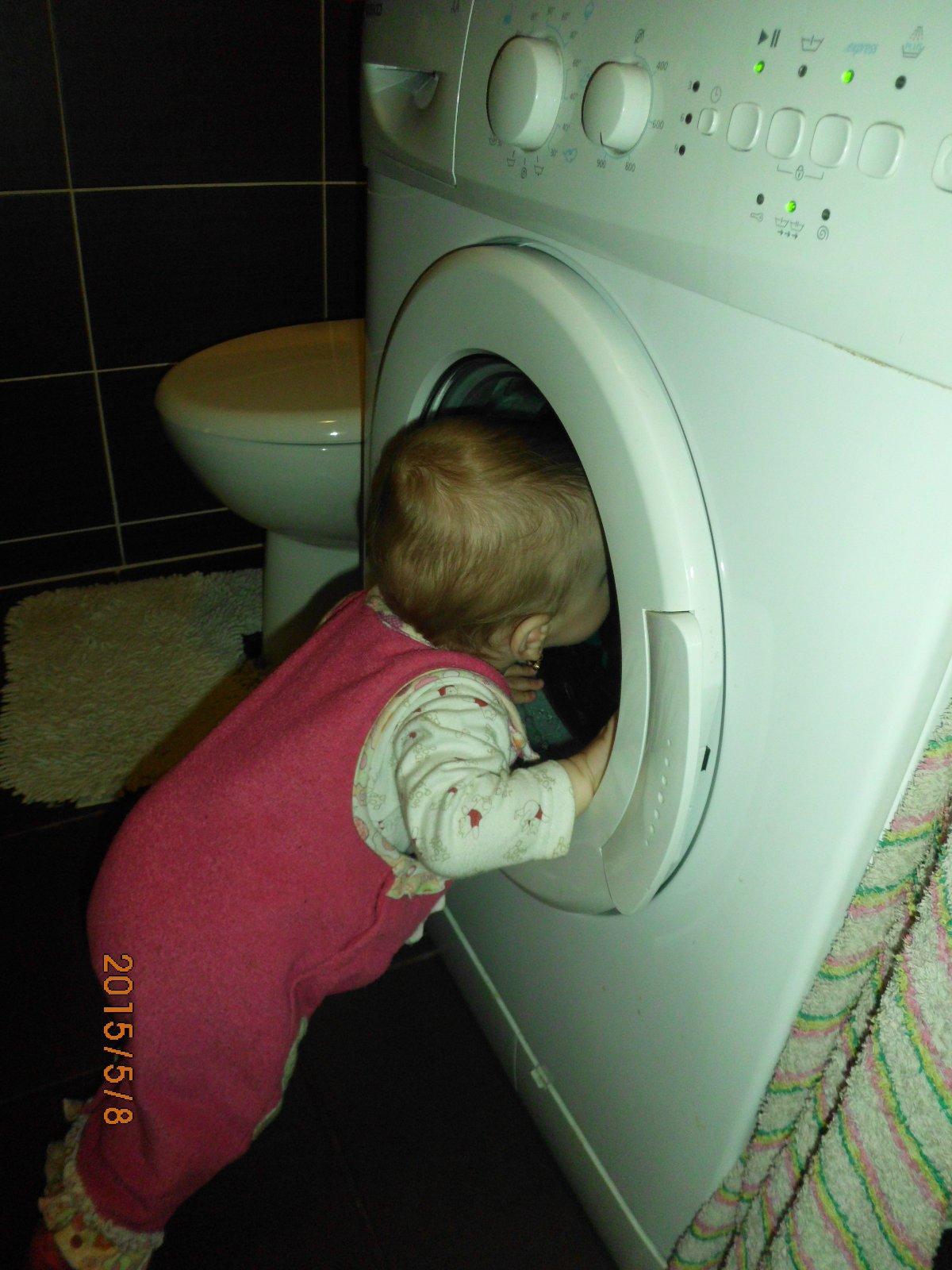 Dcérka sa teraz všade stavia a tak jej najnovšou zábavkou je chodiť "púšťať" práčku spolu so mnou...mama hádže prádlo dnu, malá ho vyťahuje von...ale keď vyhrám boj, tak spolu pustíme práčku, malá ešte skontroluje či sa napustí voda a začne sa bubon točiť a keď áno, spokojná odíde za mnou von z kúpelne.