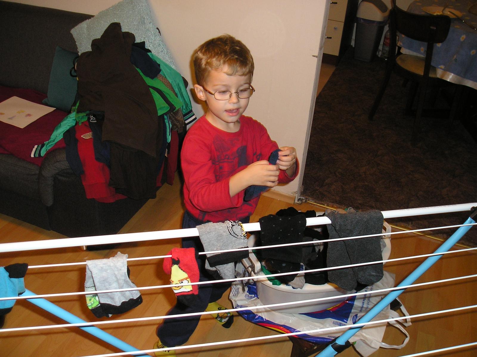Drobček s praním zatiaľ nepomáha, ešte je malinký a do kúpeľne ho zatiaľ nepúšťame aj preto, že sú v nej prášky a iná drogéria... strašne rád sa ale plazí popod povešané prádlo a vykonáva kontrolu kvality opratého prádla...