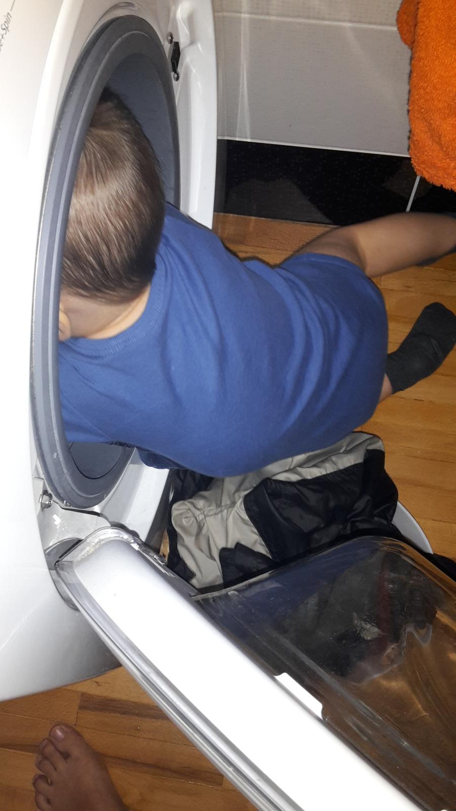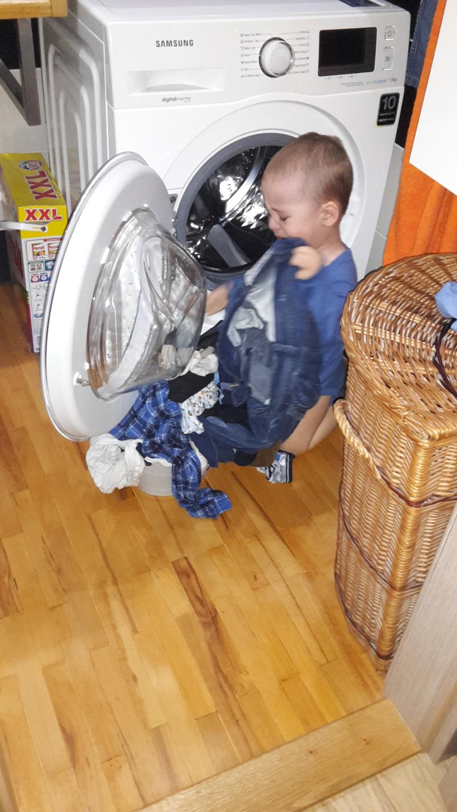 (keď to spravil po prvý-krát, som bola zúfalá že práčka doprala a prádlo komplet mokré, pustila som práčku 3x a výsledok stále rovnaký, už som sa zmierila s tým, že musíme urgentne kúpiť novú práčku, keď som prišla na to, že malý mi zmenil nastavenie otáčok na vypnutie žmýkania 🙂