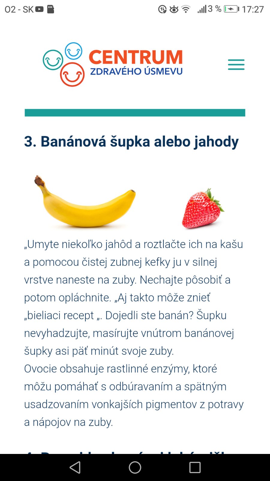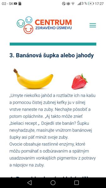 Citron/ocot, jedla soda, bananova supka/jahody, peroxid z lekarnicky, bielacie zubne pasiky, pasty, pudre a pera, kokosovy olej, zuvanie zuvaciek.