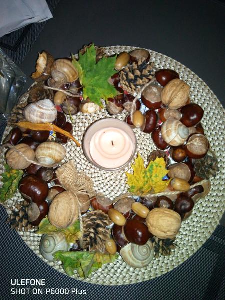 Prvé jesenné tvorenie 🙂 veniec vytvoril 5 ročný Tadeáško zo zmotaných novín, gaštanov a dalších drobností, ktoré sme našli pri prechádzke.