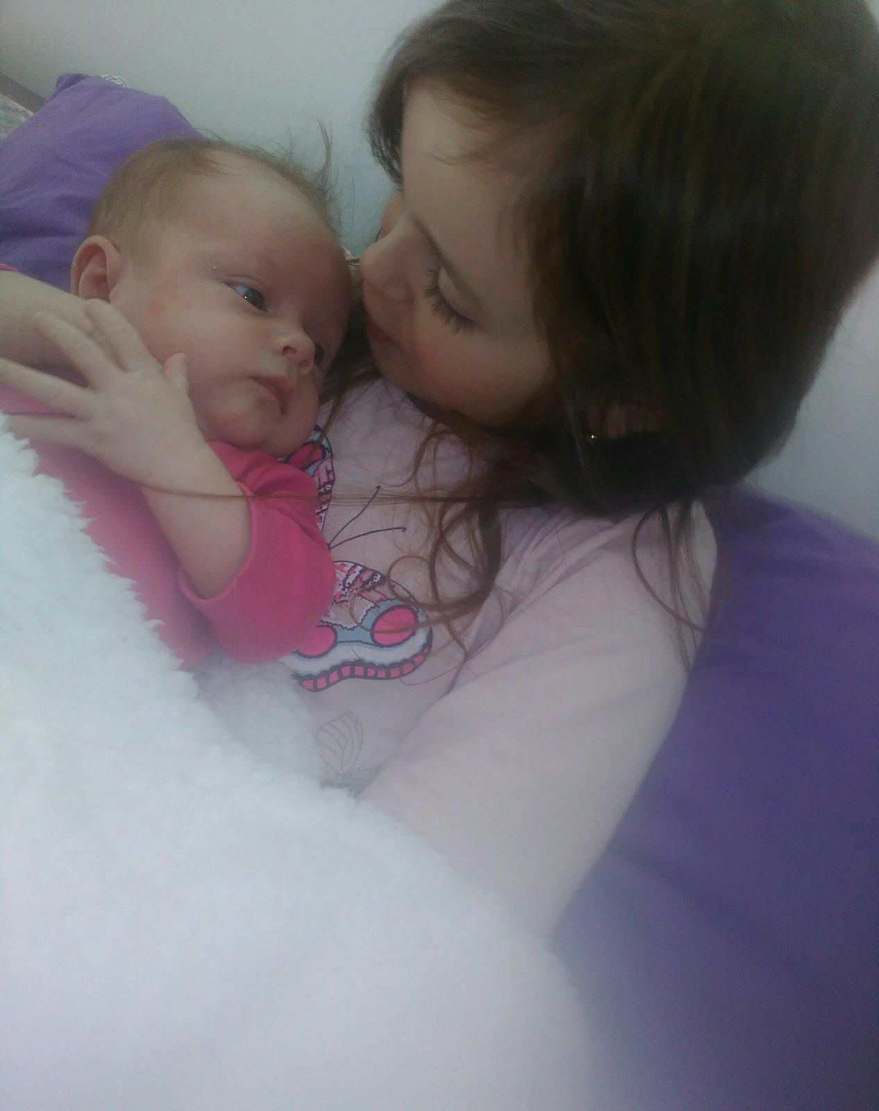 Naše princezničky Melinka a Ľubinka .. Melisska veľmi túžila po sestričke - najlepšej kamoške, živej bábike. Toto je aktuálna fotka, ktorá vystihuje ich nesmiernu súrodeneckú lásku, srdiečko mi hladí, keď vidím ako sa ľúbia. Malinká Bubinka je pri veľkej sestričke veľmi spokojná. A ja ,keď pozerám na tie naše poklady som najšťastnejšia a hrdá 🙂