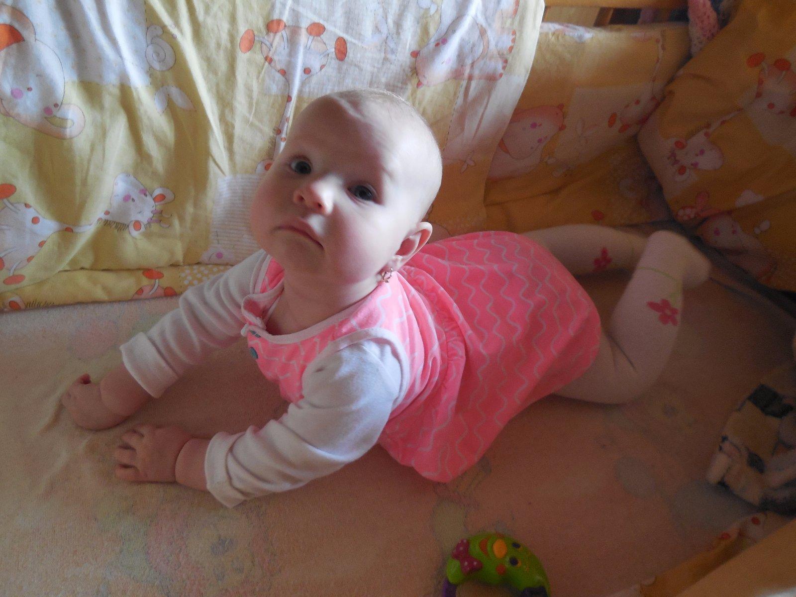 ...som sa rozhodla našu malú Simonku 🙂 krásne poobliekať do šatôček ako dajakú modelku a ona mi takto krásne ako správna modelka aj zapozovala (ako keby to vedela). 🙂 Túto fotku mám veľmi rada (najradšej mám toho človiečika na nej), a prečo? pretože už moje polročné dievčatko vyzerá ako veľké dievčatko - a skúšané šatky z nej robia naozajstnú kočku a ja jej veľmi rada spievam: "si kočka, si kočka, si kočka..."🙂