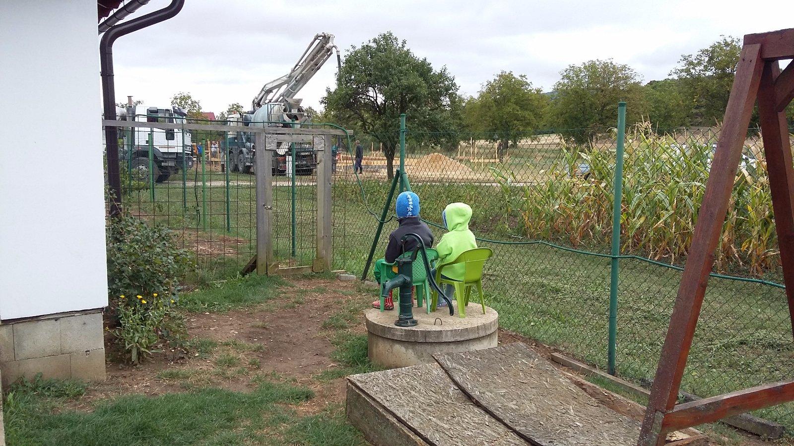 Tuto fotku mam velmi rada. Vznikla toto leto. Budeme mat novych susedov. No moje deti sa tesia asi najviac, velke stroje, majstri, bucha sa, klepe, kopu jamy,... A takto sledovali ako sused betonuje zaklady. Aj stolicky si dali na studnu,aby dobre videli (nedovolila som totiz ist na stavbu). No fobre dlho sme o nich nevedeli, tak cuskali a sledovali.
