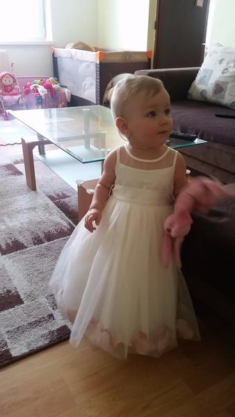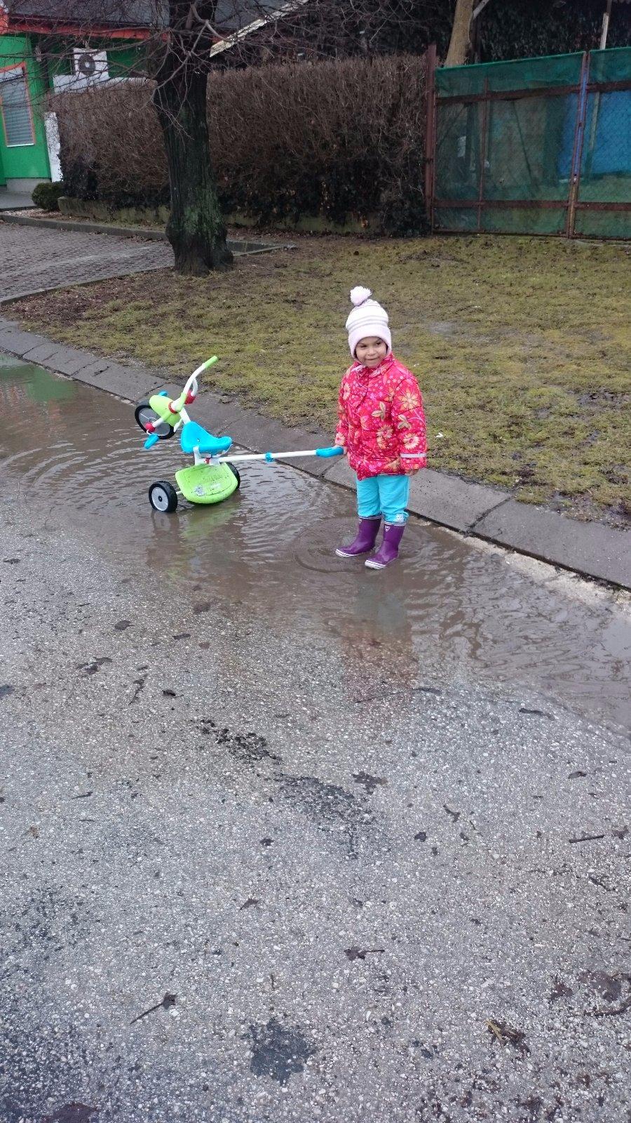 Na túto fotku mám veľmi príjemné spomienky. Boli sme vtedy na návšteve u kamarátky a celý víkend pršalo, tak sme si povedali nevadí a išli sme von v najväčšom daždi. Dalinka dážď zbožňuje a aj napriek tomu že mala gumáky do ktorých jej zhora zateka a nohy mokré do nitky, s radosťou skákala do polmetrovych kaluzi a vooobec jej nevadilo že má vodu a blato až za ušami 🙂 samozrejme potom nasledoval asi hodinový kúpeľ 😀