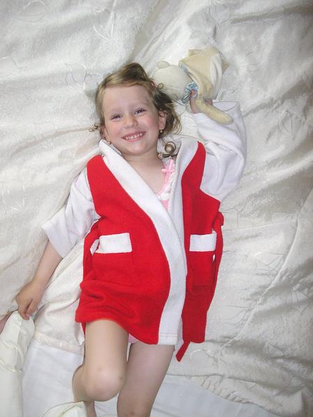 Túto dcérkinu fotku milujem... Nie je síce ani umelecká a možno ani výnimočná, ale pre mňa má tú najväčšiu cenu. Pripomína mi, aké sú šťastné chvíle a zdravie vzácne... Mali sme vtedy veľmi ťažké obdobie: dvaja naši milovaní blízki prehrávali svoj statočný boj s vážnou chorobou a aby toho nebolo málo, našej vtedy 3-ročnej dcérke potvrdili boreliózu. Očernela jej nožička, mala vysoké horúčky, nemohla chodiť... Nosila som ju po byte na rukách a modlila sa, aby bola opäť zdravá a veselá. Liečba trvala veľmi dlho, ale dočkali sme sa. Po roku mala konečne dobré výsledky a tak sme po prvý krát išli "wellnessovať" do útulného penziónu. Táto momentka vznikla na izbe po veselom kúpaní v bazéne. Boli sme šťastní a naša malá láska mala zase radosťou rozžiarené očká. Vždy, keď sa na túto fotku pozriem, cítim veľkú vďačnosť za svoju rodinku a za to, že držíme spolu, v zdraví aj v chorobe...