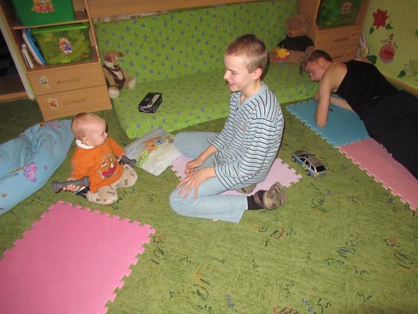 Pri všetkom úsilí starostlivosti o našich 6 detí sa mi občas podarí nájsť si čas aj na cvičenie, kedy mením našu herňu na minitelocvičňu a cvičím, koľko sa dá (hodinka to ale isto nie je 😉) a keďže nie všetky deti spia a nie všetky deti sú v škôlke/škole, tak z ich vlastnej iniciatívy a záujmu sa pridajú ku mne a cvičia tiež 😀 😀 😀