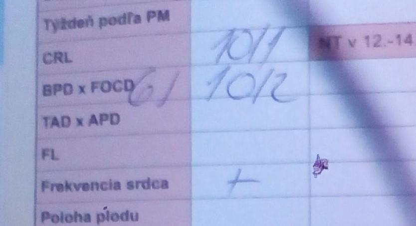 @dava55 ale to nie je 10,1... to je 10/1.. to nie je desatinná čiarka ani omylom.. niekto píše crl v milimetroch (ako moja lekárka) a niekto v týždňoch, ktorému zodpovedajú... pre 10+0 sa v tejto tabuľke: https://www.modrykonik.sk/velkost-plodu-pocas-t... uvádza 3,1 cm... ak by malo dieťa veľkosť 10,1cm bol by to už cca. 16tt... čo je dosť veľký rozdiel... okrem toho.. je to zapísané v stĺpci pre ultrazvuk medzi 10.-14. týždňom... takže lekár/ka to zapísala v zodpovedajúcich týždňoch a nie v milimetroch... Dieťa v tom dni, kedy bola na kontrole zodpovedalo veľkosti 10 týždňa a jedného dňa, čiže prebiehajúci 11. týždeň.