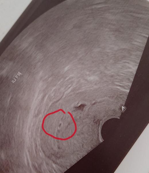 Hematom sa nachadza v dolnej oblasti dolneho polu pl. Vajca drobec ma 10,78 mm a hematom 10x14 mm hned pod nim