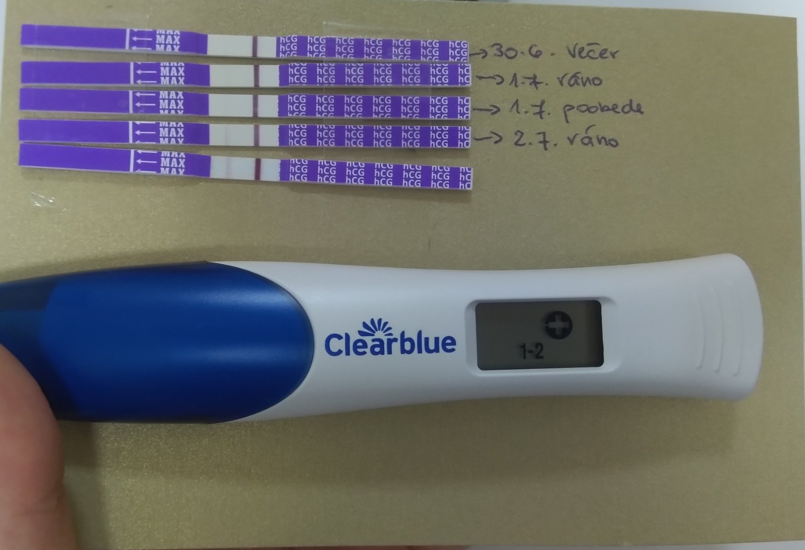 pokojne si mohla mat ovu hned po skonceni MS (ja som uz parkrat mala ovu 6-8DC), podla prveho testu si mohla byt tak 7-8DPO. odrataj si teda tych 7-8 dni od 30.6. a vtedy mohla byt ovu.