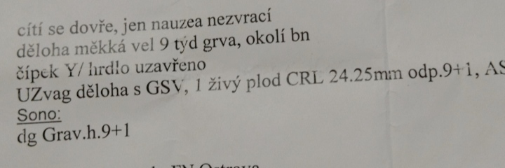 Pìšu len o prosperujúcom tehotenstve, ani náznak o veľkosti maternice. Maternica s gestačným vakom, 1 živỳ plod o veľkosti 24.25mm. 9týždňov +1deň