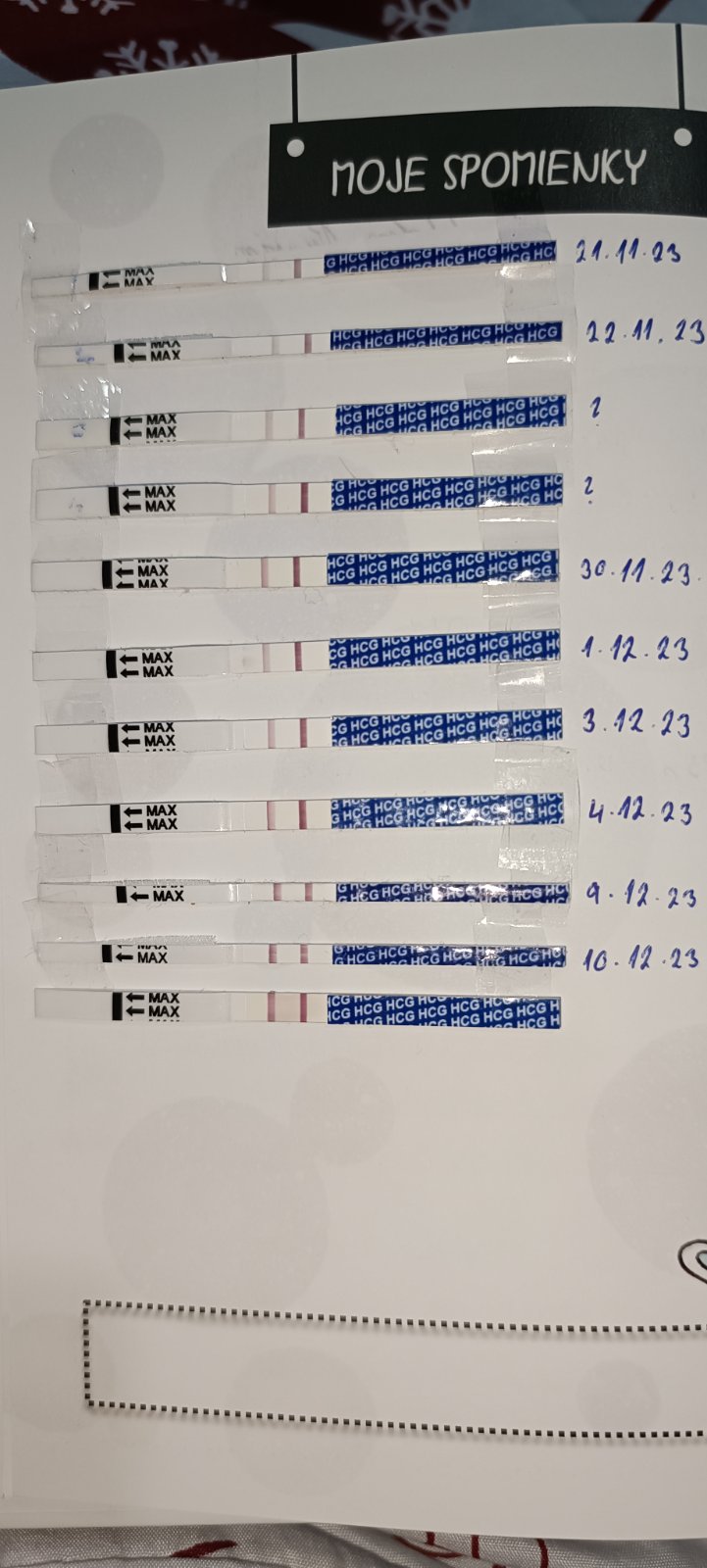 Dobrý deň.32 dni mi meška ms stým že mam pozitivné testy len na sone vidno iba vačok.Posledná ms bola 15.10. prvý test tehotenský som si robila 13.11 no bol ešte negativny a ďalší som si urobila 21.11 clear blue a bol už pozitivní ukazal mi +2-3 a 5.12 už ukázal 3+ myslíte si že je tam ešte nejaká nádej že sa tam bábo ukáže ? Doktorka mi povedala že počkame este týžden že možno sa mi potrat spusti sám a keď nie tak potom sa to bude riešiť zakrokom😭😭 pridávam aj tehotenské testy ako mi silneli postupne.Ten posledný bez dátumu je dnes robený po kontrole u doktorky.