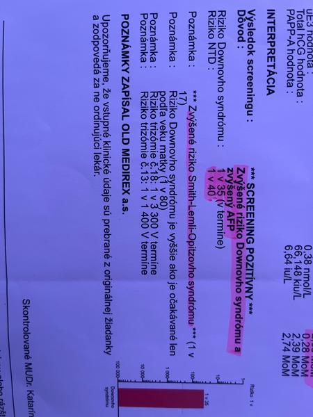 @kris_tin257 pozri toto boli moje výsledky vzhľadom na nifty pro hneď dva sa vylúčili ale bohužiaľ nifty pro neskúma Slos syndróm… a ja som mala možnosti odobratie krvi obidvom čiže mne a mužovi ale to nepripadalo do úvahy nakoľko bol mimo SR potom som mohla zaplatiť ďalšie testy tuším trizomy tie širokospektrálne kde už Slos vyšetrujú ale keďže na ukončenie potrebuješ amnio tak som sa rozhodla pre amnio - chcela som si zaplatiť prednostne amnio výsledky ale nepripadalo to do úvahy lebo Slos sa vyšetruje až 14 dni … predbežne výsledky mi došli hneď vten večer z krvi okolo 22:00 negatívne plodová voda do 48 hodín negatívna …. Slos až 14 dni trval … to mi zavolali z genetiky vten moment mi srdce prestalo fungovať lebo som sa bála nakoľko všetky výsledky mi došli meilom .. Geneticka mi volala