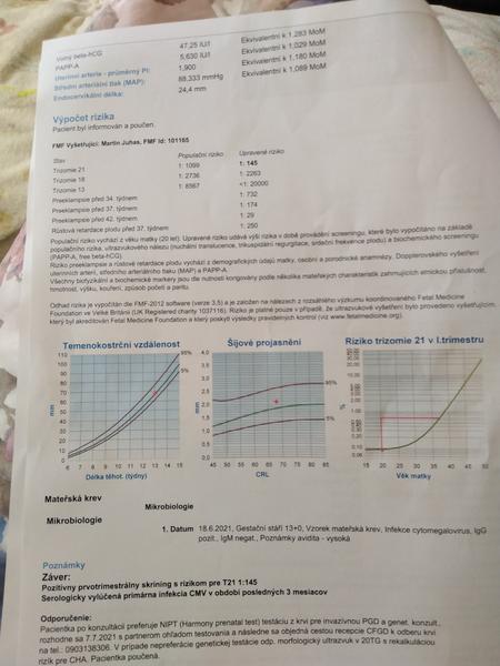 @miankass 1:145 na aku chorobu/anomaliu? vzdy je to jedna pravdepodobnost pre konkretnu diagnozu - napr. downov syndrom, razstep trubice...neexistuje vysledok jedno cislo a na vsetky choroby a hlavne pravdepodobnost 1:145 nie je matematicky 80/20 - tak to fakt neviem ako tvoj lekar vypocital 🤷♀️