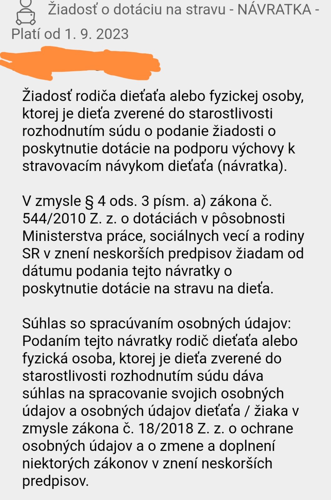 Syn bude od septembra predskolak v skolke, cize chapem ze sa to vztahuje na stravu zdarma, ale nechapem preco je tam vobec spomenute ze ide o dieta zverene nam do starostlivosti rozhodnutim sudu. Jednak je uz je 4 roky oficialne nas a tym padom v ociach zakona je brany ako nase biologicke dieta a preco to tam vobec spominaju, co to ma s tym spolocne a preco na edupage este k tomu.