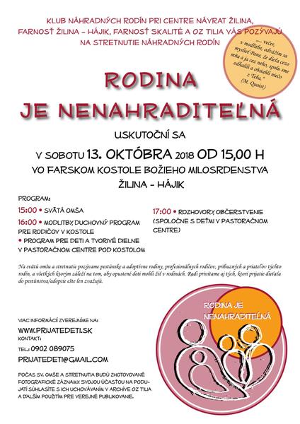 Zdieľam informáciu o sv. omši a stretnutí náhradných rodín 13. 10. 2018 v Žiline - niekomu z Vás je to možno blízke (geograficky a hlavne hodnotovo, tematicky). Viac info na www.prijatedeti.sk
