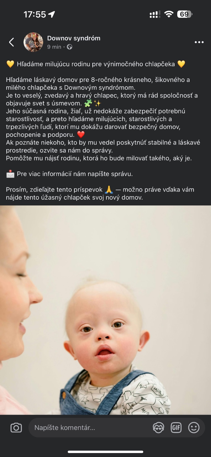 @anonym_autor inzerát ako darujem mačku. Ale k tej dajú aspoň reálnu fotku a nie stiahnute bábätko z internetu. No neviem pride mi to hlúpe takto zdieľať nerozumiem prečo nehľadajú v nejakých zoznamoch ľudí čo čakajú na adopciu. Určite teraz náhodný človek na Facebooku si povie jzs super akurát som si chcel adoptovať dieťa s downovým syndrómom aby som mohol odísť z práce na opatrovateľský, starať sa oňho 24/7 a prispôsobiť mu celý môj doterajší život