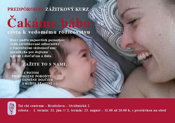 Milé mamičky, srdečne vás pozývame na sobotný zážitkový kurz: ČAKÁME BÁBO – cesta k vedomému rodičovstvu. 21. jún a 23. august v centre BA. – Kurz nielen podá komplexné informácie ohľadom pôrodu, štartu dojčenia, jeho podpory, predchádzaniu problémom pri ňom, ako aj všetko k opatere a najmä komunikácii s dieťaťom, ale najmä AKO POROZUMIEŤ DIEŤAŤU, jeho potrebám. Sme z praxe, sme odboorníčky s viacročnou praxou. Dula, žena, ktorá sprevádza matku pred pôrodom i pri ňom. Podporujúca žena. A poradkyňa pre dojčenie a život s bábätkom s históriou pomoci takmer 700 matkám pri problémoch pri dojčení a pri nedorozumeniach, neporozumení dieťaťu. ABY STE SI ROZUMELI A BOLI ŠŤASTNÍ 🙂 ZAŽITE TO S NAMI a rezervujte si miesto na kurze prihláškou cez web o čakaní bábätka 🙂 PRE VIAC INFO: Máme vizitku v sekcii PROFESIONÁLI.