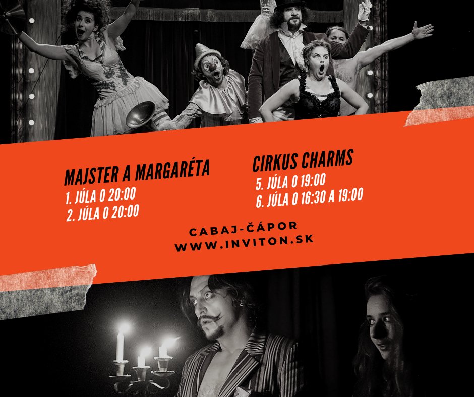 Ahojte, chcela aby som vám dať podnet na veľmi pekné divadelné predstavenie Cirkus Charms od súboru Teatro Tatro, hrá sa 5.7.2019 o 19:00 hod a 6.7.2019 o 16:30 hod. v Cabaj Čápore pri salaši. Je to farebné, s pesničkami, deťom sa to zvykne páčiť. Ak máte záujem, prikladám plagát. Pekný deň 🙂