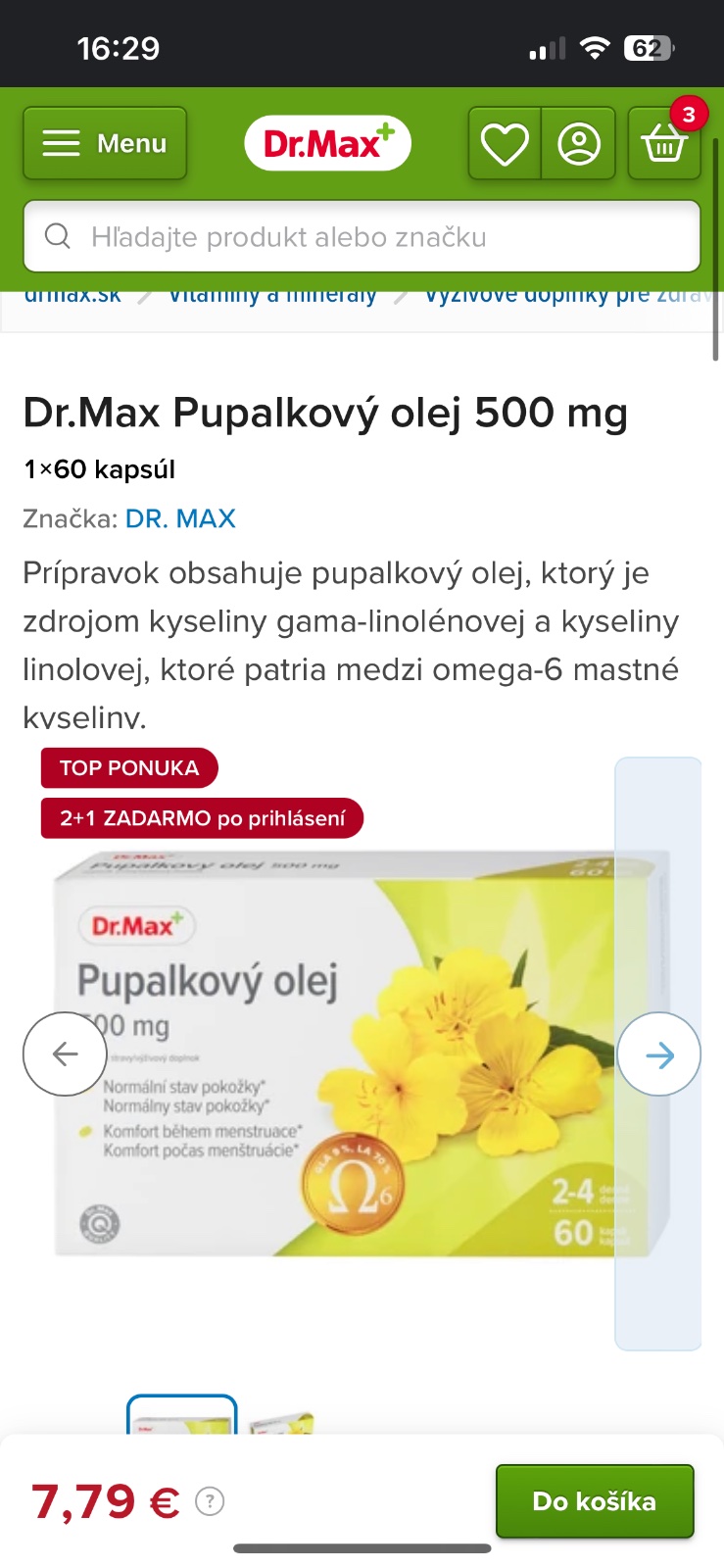 Dobrý deň prajem, máte niekto skúsenosť s Pupalkovým olejom? Mám 23 rokov a chcela by som to na úpravu hormónov, mám hormonálne akné a rastú mi chĺpky na brade😔V minulosti som užívala aj antikoncepciu akné mi zmizlo, ale priberala som z nej a bola zavodnená. Liečim si akné u kožného,chodím pravidelne ku kozmetičke aj na chemické peelingy čistenia ale nepomáha mi to, potrebujem niečo zvnútra. Teraz je akcia na Dr.Max 2+1 balenia na 3 mesiace. Máte niekto s tým skúsenosť? Ďakujem vám veľmi pekne a prajem všetko dobre v novom roku 2024.