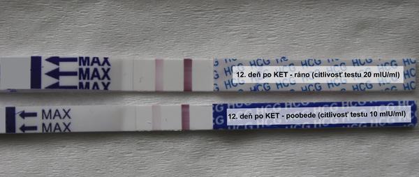 Kedze som mala vela vajicok a nabeh na OHSS, cerstvy ET sa nekonal. Zamrazili nam teda 9 ks embryjok v kvalite expandujucej blastocysty. V marci som bola na prvom KET, kde som na 15 den mala hodnotu HCG len 11. O 3 dni neskor uz krv bola negativna, takze embryjko to vzdalo. Po prvom KETe som sa dost setrila. Teraz 15.4.2015 som podstupila druhy KET, a stvrty den po KET som uz letela do Spanielska, kde som 6 dni denne 10 hodin bola na nohach a chodila. Takze ziadne setrenie, nic. Sice mam v podbrusku od vcera pocit ako na MS, ale dufam, ze to tentokrat dobre dopadne. Dnes som 12 den po KET, urobila som si test a takto mi to vyslo. Este mi zostal jeden kus, ten vyuzijem zajtra a v stredu idem na krv.