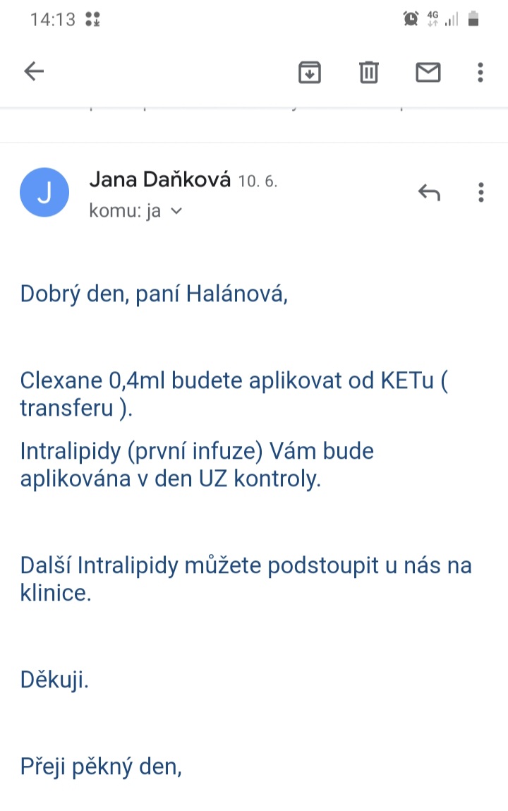 @lydia86 mne ju sestra odporučila takže ju beriem neviem či som nezačala 4 balenie. No dneszajtra ma prísť ms zatiaľ nič. No na 12dc idem na sono do Brna aj na intralipid tak sa spýtam od kedy mám pichať clexan či už pred vkladom keďže mám za sebou 7x MA a mám trombofiliu mutáciu MTHFR C677T homozygot.
