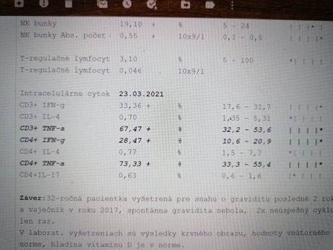 Zaroven doma som si v lekrskej sprave precitala dodatok ze vysoky o sah cytokinov brani prirodzenemu otehu. My vsak 1 dieta uz mame prirodzenou cestou ( r2016) a druhe sa toez podarilo prirodzene v roku 2017 no skoncilo potratom. V lekarskej sprave mam aj vyznacene hladiny cytokinov no nevyznam sa v tom lebo ona mi hovorila len ze som bojovala proti plodu. Voe poradit niekto?
