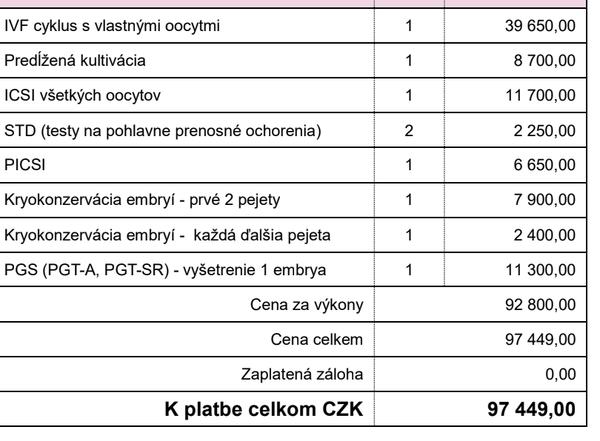 LIECBA - Moja skusenost zatial - dobre nastaveny protokol kde som presne reagovala na liecbu a vnimala som ze to maju pod kontrolou. Lekarka respektovala ze mam trosku neskorsie ovulaciu prirodzene a nastavila mi dlhsi kalendar. Kazdy krat ma sice videl iny doktor (co napr partner nebol spokojny - ocakaval trosku individualnejsi pristup s "nasou" doktorkou) ale ja to chapem kedze sme chodili presne podla mojho cyklu a nie podla toho kto ma aky den smenu. Vzdy sa zorientovali v karte ked sa somnou bavili a vsetci boli profi. Komunikacia so sestrickami aj koordinatorkou aj recepciou bola super vzdy rychle vybavili vsetko co som potrebovala a predavali si navzajom informacie. Mali sme dostatok casu sa pytat na veci a vsetci nam trpezlivo odpovedali aj ukazali ako co robit. Jedina vec co by som vytkla ze som si musela sama vypytat tuto kalkulaciu co zdielam predtym nez sme podpisovali vsetky papiere pred odberom vajicok, ale poslali ju zase obratom a celkovy cennik som mala k dispo len som si chcela byt ista ze ktore sluzby teda platia pre nas aby sme mali nachystane peniaze na karte na to. PGS testovanie sme nakoniec nedali kdze nemame rizikove faktory - to by este narastlo podla poctu embryii, to podpisujete pred odberom vajicok kolko chcete otestovat aj ako chcete zmrazit.