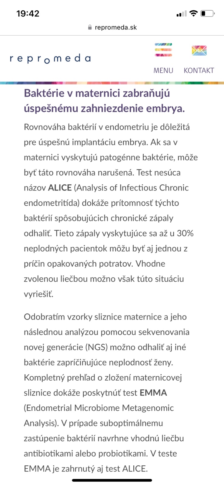 @janie7 to ano, verim že to niektorým pomohlo, ale práve tie ďalšie dve mi prídu ešte dôležitejšie, lebo predsa tiež nemôžeme vedieť čo sa deje v rámci našej maternice. Aj čo som čítala, tie baktérie môžu spôsobovať neúspešne vklady lebo prostredie nie je tým pádom vhodne pre embryjko. No uvidím po krvi, porozprávam sa s lekárom, predsa to stojí 1200 €.