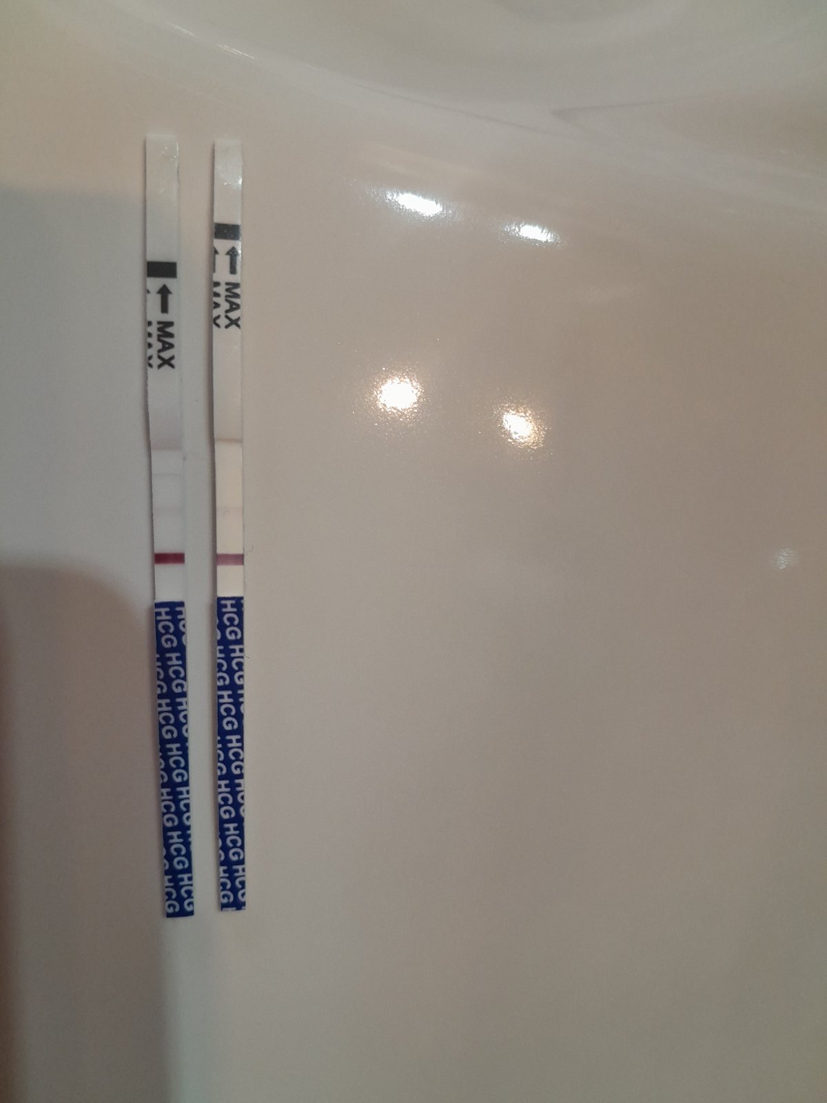 Ahojte, u mňa takto. Vrchný test robený včera poobede a spodný dnes ráno. Nedalo sa mi to dobre odfotiť, ale v skutočnosti je čiarka ružová. Myslela som, že dnes už bude silnejšia ako včera, ale zdá sa mi ešte slabšia 😏 tak neviem. Viac testov už doma nemám...Včera ma riadne bolelo brucho a dnes aj kríže.